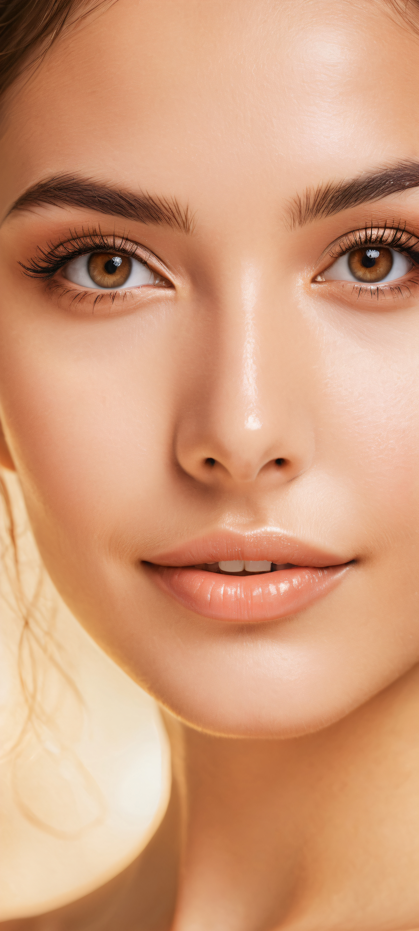 A breathtaking vertical portrait artwork of A captivating girl, placed in the lower-middle with insane micro-details, showcasing her beautiful brown eyes and mesmerizing smile as she looks directly at the viewer, highlighting every intricate eyelash., A perfectly clean and empty top half with vast pure void, allowing for an unobstructed view, with a subtle gradient transitioning to a warm beige tone in the lower half, evoking a sense of serenity., Award-winning digital art, pristine clarity, with stunning visual impact, capturing the essence of a serene and peaceful atmosphere., Ethereal softbox lighting, with gentle, radiant rays illuminating the subject’s features, creating a warm and inviting glow that seems to emanate from within, bathing the entire scene in an otherworldly radiance., Dominant palette: Soft golden beige (#F5DEB3), Creamy white (#FFFFFF), Warm brown (#964B00), with subtle hints of rich chocolate (#754975) and delicate pink (#E4D6F5), ethereal lighting, radiant, brilliant colors, ray traced reflections, pristine clarity, portrait composition, centered subject in the lower middle, perfectly clean and smooth top half for UI, extreme depth of field blurred background, highly textured surfaces, intricate micro-details, physically based rendering, award-winning digital art, epic breathtaking scale, stunning visual impact, perfect composition, macOS wallpaper aesthetic, masterpiece, 2K QHD resolution, 9:20 aspect ratio.