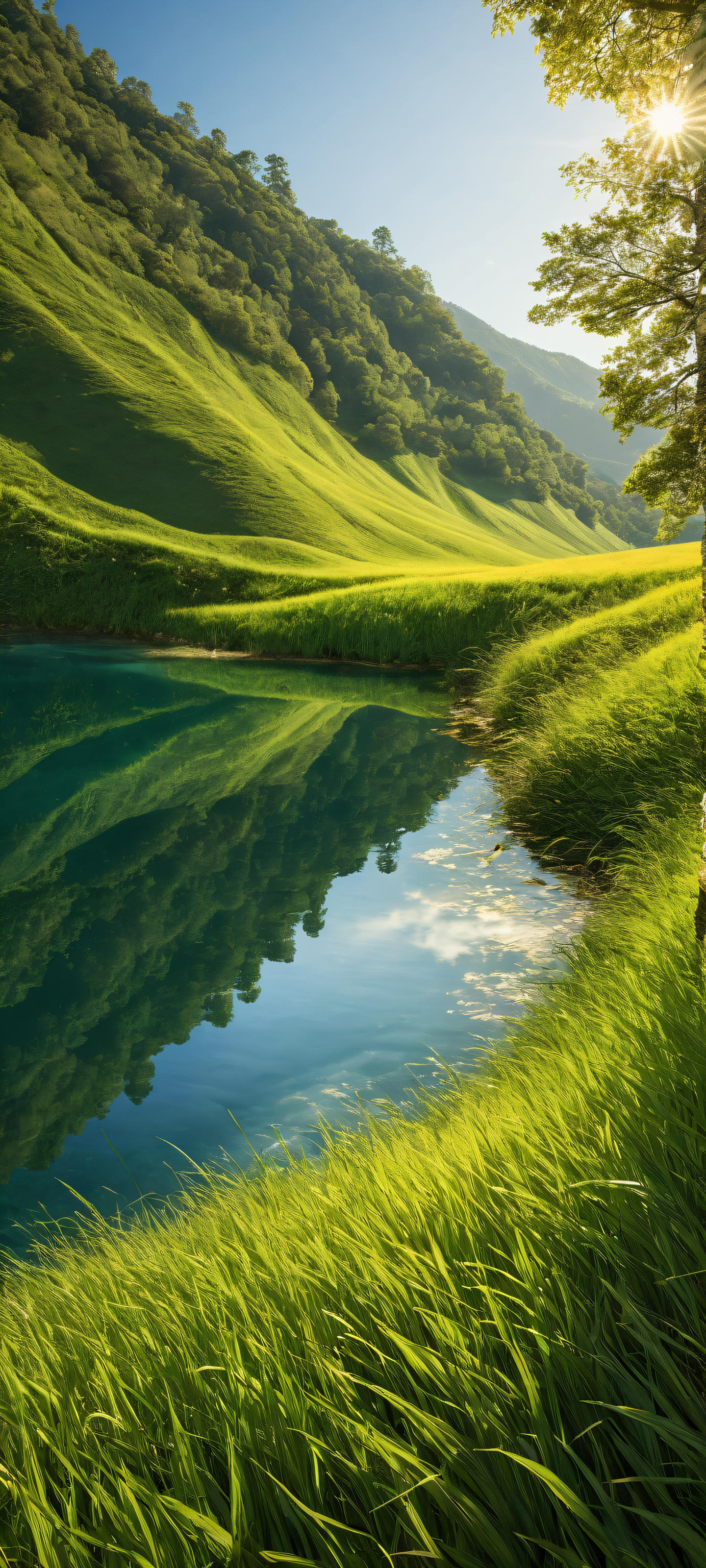 A breathtaking vertical portrait artwork of A majestic grassy hillside with fallen leaves placed in the lower-middle, intricate micro-details of leaf veins and edges, Perfectly clean and empty top half with a vast pure void of sky, gently rolling hills of green grass, and serene waters in the distance, Award-winning digital art, stunning visual impact, and pristine clarity, Ethereal sunlight casting warm rays upon the scene, with subtle ray-traced reflections on the water’s surface and leaves, Dominant hues of golden yellow, earthy tones, and soft greens, evoking a sense of serenity and connection to nature, ethereal lighting, radiant, brilliant colors, ray traced reflections, pristine clarity, portrait composition, centered subject in the lower middle, perfectly clean and smooth top half for UI, extreme depth of field blurred background, highly textured surfaces, intricate micro-details, physically based rendering, award-winning digital art, epic breathtaking scale, stunning visual impact, perfect composition, macOS wallpaper aesthetic, masterpiece, 2K QHD resolution, 9:20 aspect ratio.