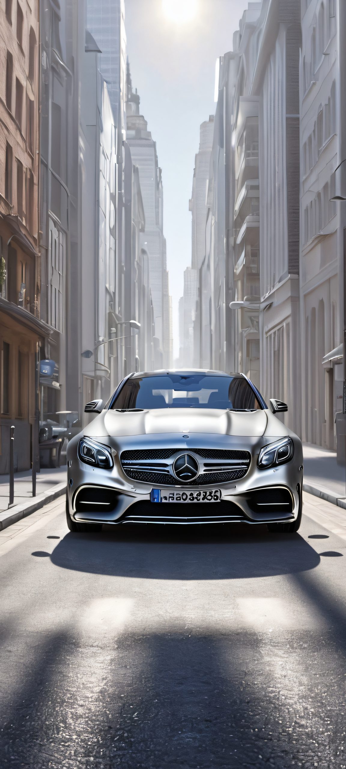 Elevate your mobile experience with this breathtaking 2K QHD wallpaper of a luxurious silver Mercedes parked on a bustling city street, perfectly optimized for iPhone, Samsung Galaxy, and Android home screens. The high-quality details and realistic depiction will transport you to the heart of the city.