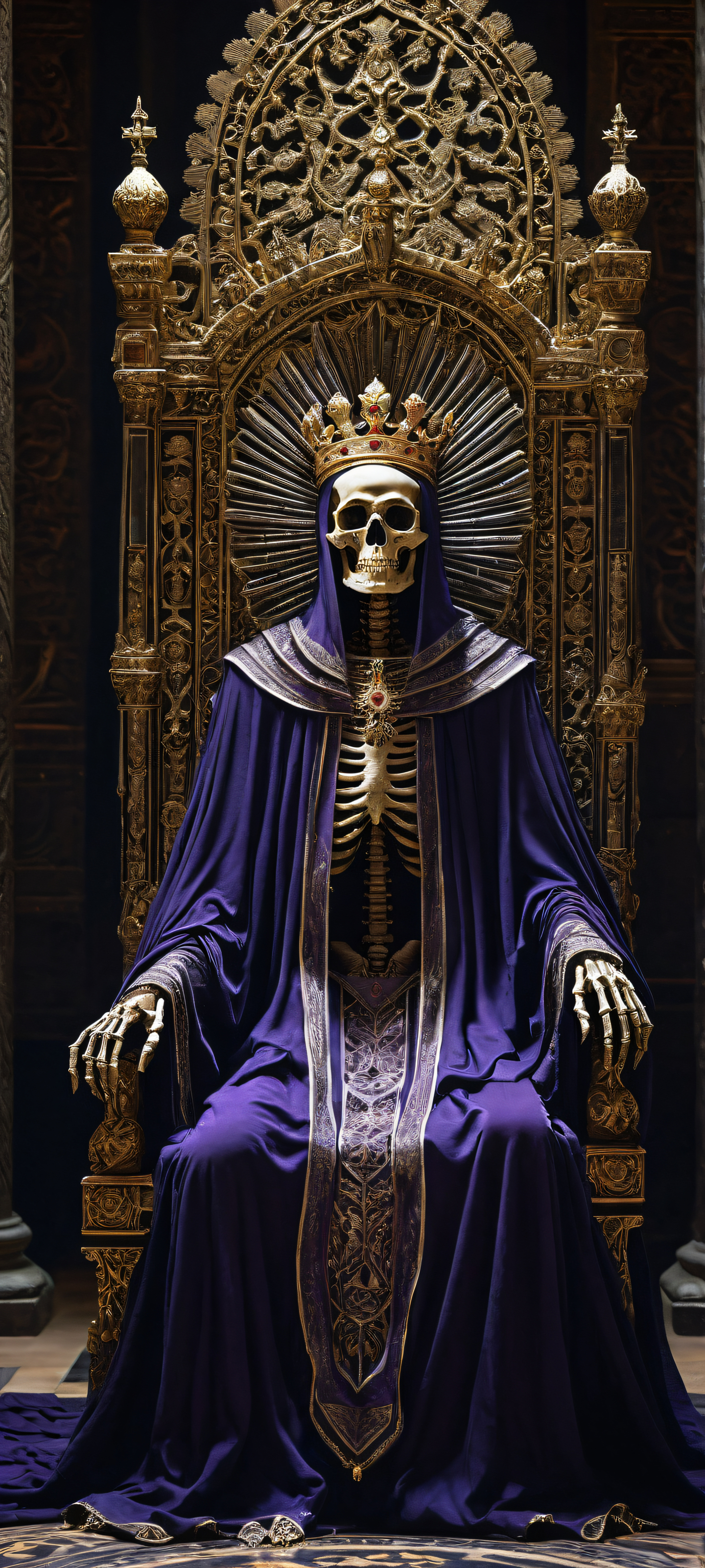 A breathtaking vertical portrait artwork of The Skeleton King is placed in the lower-middle, intricate micro-details of his weathered skull and facial features under the thin black translucent shawl., Perfectly clean and empty top half with vast pure void, juxtaposed against a dimly lit ancient throne room with ornate stone walls and mysterious tapestries., Award-winning digital art, pristine clarity with stunning visual impact, perfectly blending ancient mystique and eerie intensity., Ethereal lighting with a beam of midnight light casting an otherworldly glow on the scene, while the glowing purple gemstone on the crown radiates a warm, mystical illumination., Dominant color palette featuring rich dark tones such as midnight blue, black, and deep reds, accented by subtle hints of gold and purple, evoking a sense of mystery and foreboding., ethereal lighting, radiant, brilliant colors, ray traced reflections, pristine clarity, portrait composition, centered subject in the lower middle, perfectly clean and smooth top half for UI, extreme depth of field blurred background, highly textured surfaces, intricate micro-details, physically based rendering, award-winning digital art, epic breathtaking scale, stunning visual impact, perfect composition, macOS wallpaper aesthetic, masterpiece, 2K QHD resolution, 9:20 aspect ratio.