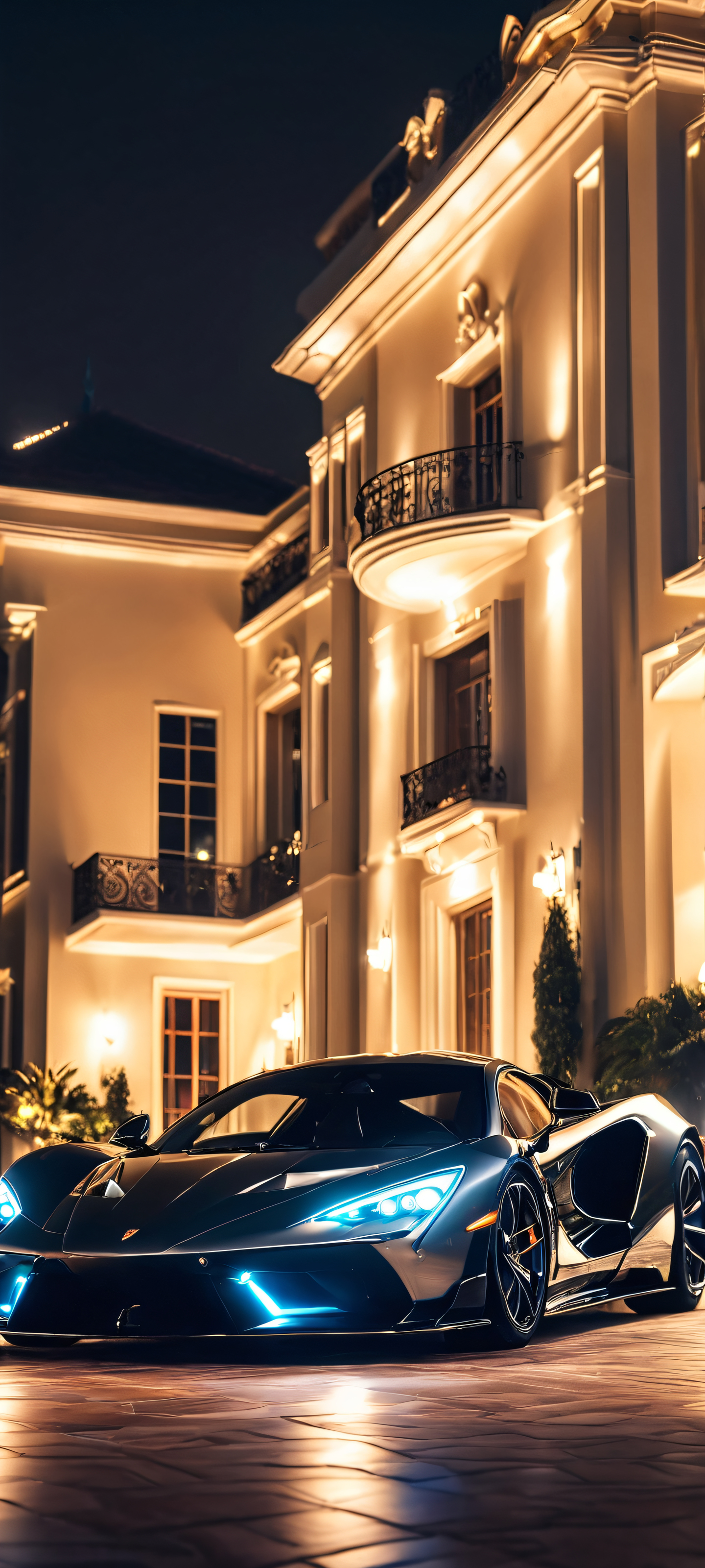 Elevate your mobile experience with this stunning 2K QHD masterpiece, expertly designed to perfectly optimize for iPhone, Samsung Galaxy, and Android home screens. The sleek supersonic design is sure to impress, with its metallic sheen reflecting the warmth of a well-lit mansion night.