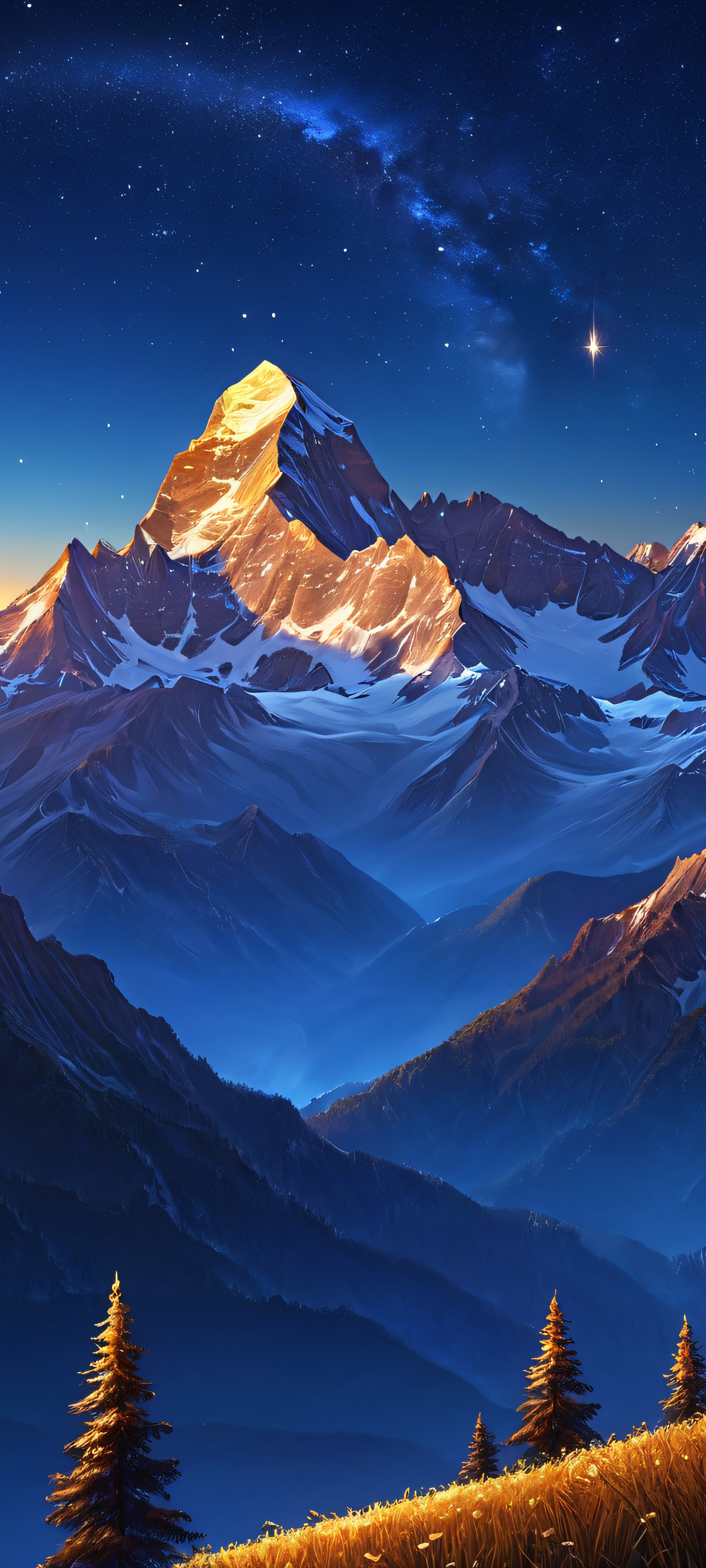 Elevate your home screen with this breathtaking masterpiece, perfectly optimized for iPhone, Samsung Galaxy, and Android devices. This 2K QHD resolution wallpaper features a majestic mountain under a starlit night sky, offering a highly detailed and realistic experience. Let the starlight serenade your senses and transport you to a world of serenity.