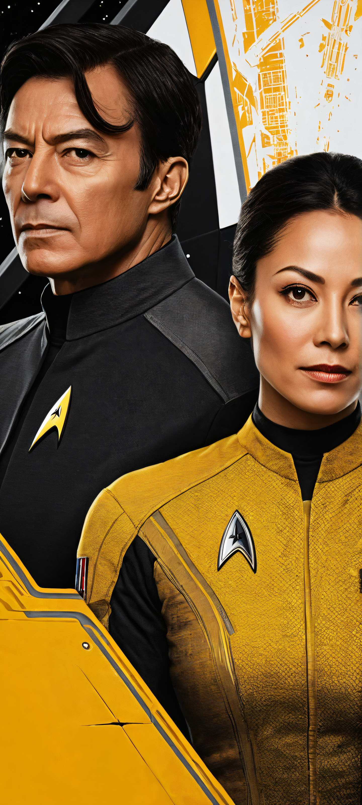 A breathtaking vertical portrait artwork of Starship Civitai’s Transition Team, with a man wearing a Yellow star trek uniform with the Civitai logo prominently displayed, placed in the lower-middle, intricate micro-details of damaged bridge panels and sparks flying everywhere, while another beautiful woman in a red star trek uniform is sitting at the helm, Perfectly clean and empty top half with vast pure void, reflecting the sleek dark mode aesthetic, allowing for insane depth of field and micro-details to shine through, Award-winning digital art, pristine clarity, with stunning visual impact like an Apple UI level wallpaper, Deep perfect blacks with crisp contrast, striking luminescent accents, and no cinematic lighting, giving a sleek and futuristic feel, Dominant palette featuring Civitai’s signature red and yellow colors, blending well with the dark mode aesthetic, elegant low-key lighting, deep perfect blacks, striking contrast, sleek dark mode aesthetic, luminescent accents, deep rich colors, portrait composition, centered subject in the lower middle, perfectly clean and smooth top half for UI, extreme depth of field blurred background, highly textured surfaces, intricate micro-details, physically based rendering, award-winning digital art, epic breathtaking scale, stunning visual impact, perfect composition, macOS wallpaper aesthetic, masterpiece, 2K QHD resolution, 9:20 aspect ratio.