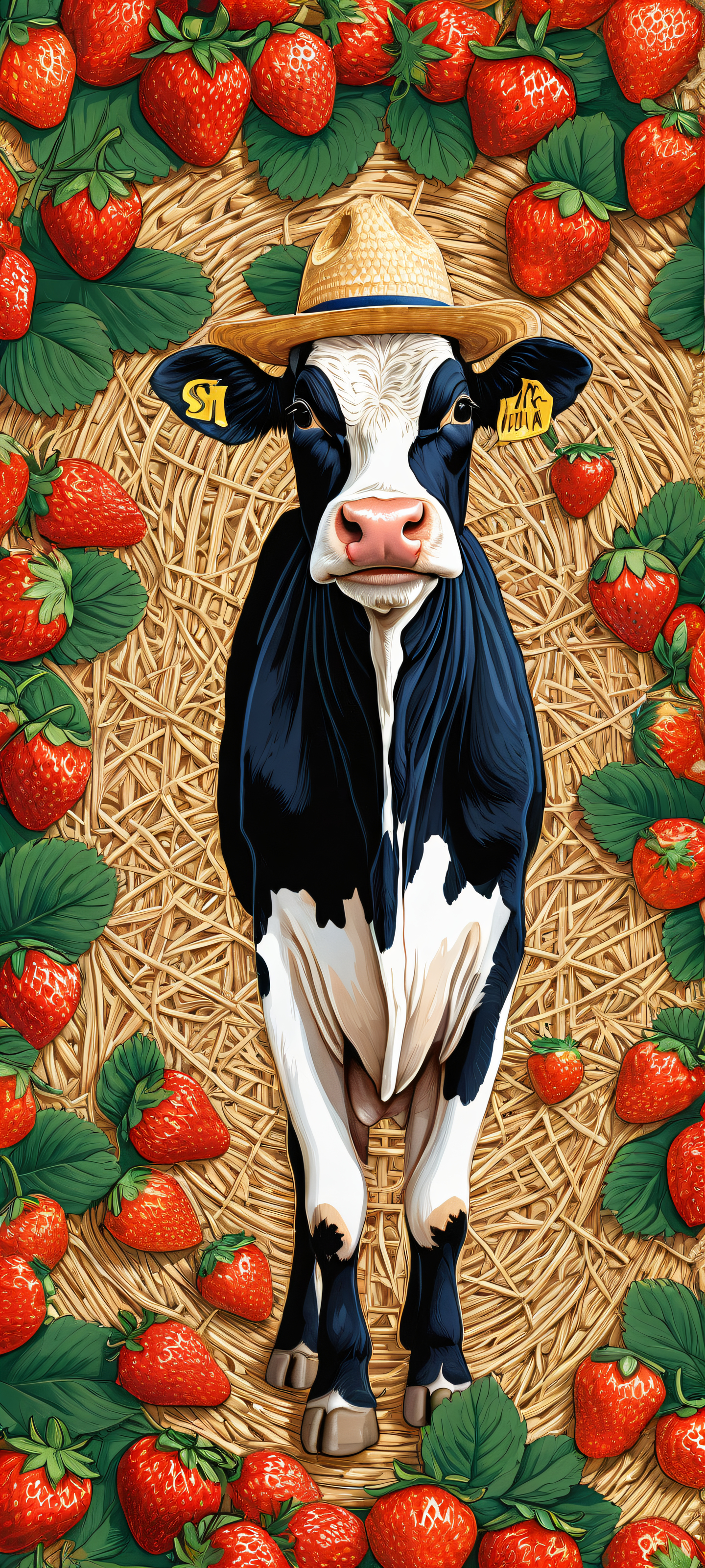 A breathtaking vertical portrait artwork of A cow-sized strawberry, orange, and blueberry, placed in the lower-middle with intricate micro-details of the farmer’s overalls and straw hat, and exaggerated utters getting milked., Perfectly clean and empty top half with vast pure void, allowing the whimsical scene to take center stage, while maintaining UI breathing space, Award-winning digital art, pristine clarity, showcasing a playful yet rustic atmosphere, reminiscent of classic children’s book illustrations, Sleek dark mode aesthetic, with deep perfect blacks, striking crisp contrast, and elegant luminescent accents highlighting the farmer’s sweat beads and the strawberry milk’s pink hue, Pastel pink, warm beige, and earthy tones, evoking a sense of whimsical wonder and rustic charm, fitting for a lighthearted farm-themed design, elegant low-key lighting, deep perfect blacks, striking contrast, sleek dark mode aesthetic, luminescent accents, deep rich colors, portrait composition, centered subject in the lower middle, perfectly clean and smooth top half for UI, extreme depth of field blurred background, highly textured surfaces, intricate micro-details, physically based rendering, award-winning digital art, epic breathtaking scale, stunning visual impact, perfect composition, macOS wallpaper aesthetic, masterpiece, 2K QHD resolution, 9:20 aspect ratio.