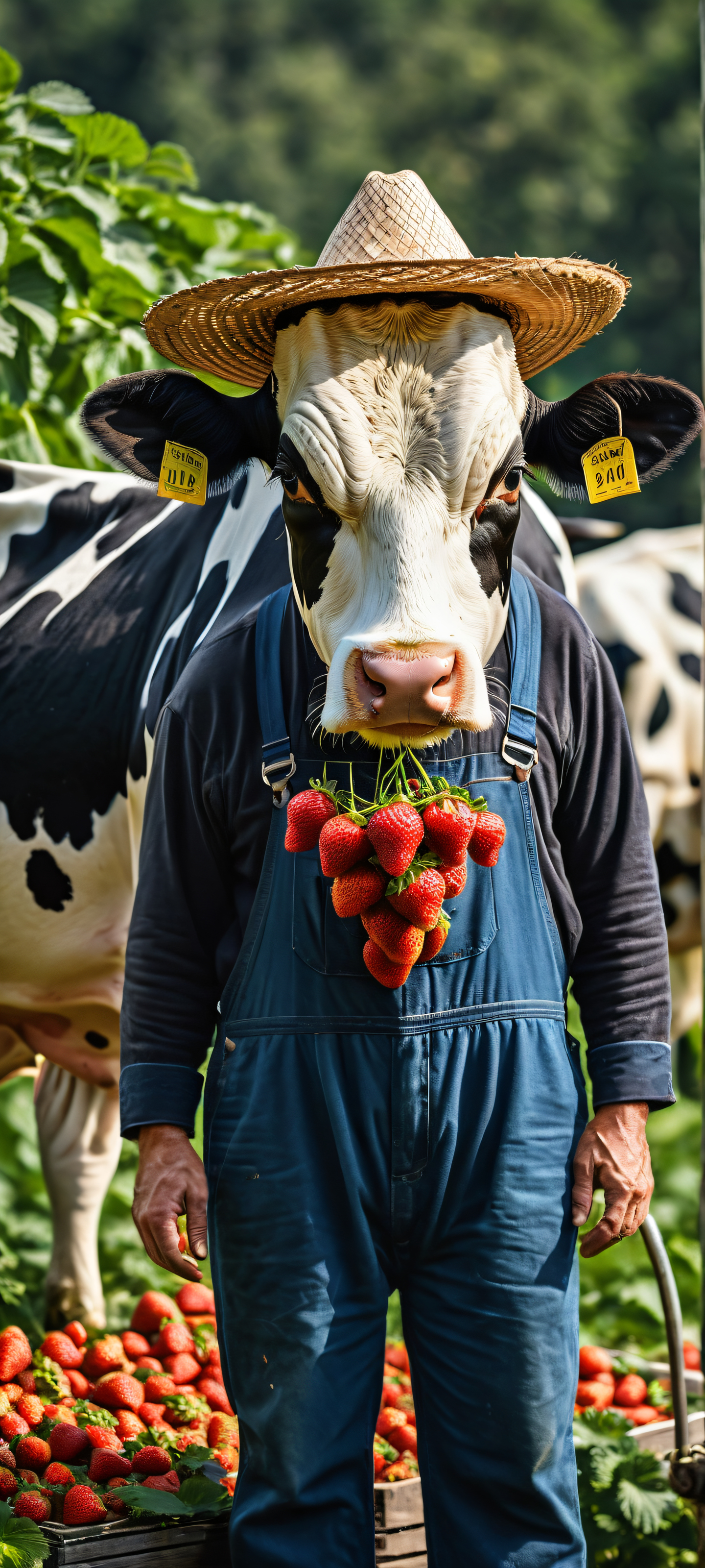 A breathtaking vertical portrait artwork of A cow-sized strawberry, orange, and blueberry with utters getting milked by a farmer in overalls and a straw hat, placed in the lower-middle with intricate micro-details, Perfectly clean and empty top half with vast pure void, Award-winning digital art, stunning visual impact, and pristine clarity, Sleek dark mode aesthetic with deep perfect blacks, striking crisp contrast, and elegant luminescent accents, [‘#FF69B4’, ‘#F2C464’, ‘#34A85A’, ‘#333333’, ‘#FFFFFF’], elegant low-key lighting, deep perfect blacks, striking contrast, sleek dark mode aesthetic, luminescent accents, deep rich colors, portrait composition, centered subject in the lower middle, perfectly clean and smooth top half for UI, extreme depth of field blurred background, highly textured surfaces, intricate micro-details, physically based rendering, award-winning digital art, epic breathtaking scale, stunning visual impact, perfect composition, macOS wallpaper aesthetic, masterpiece, 2K QHD resolution, 9:20 aspect ratio.