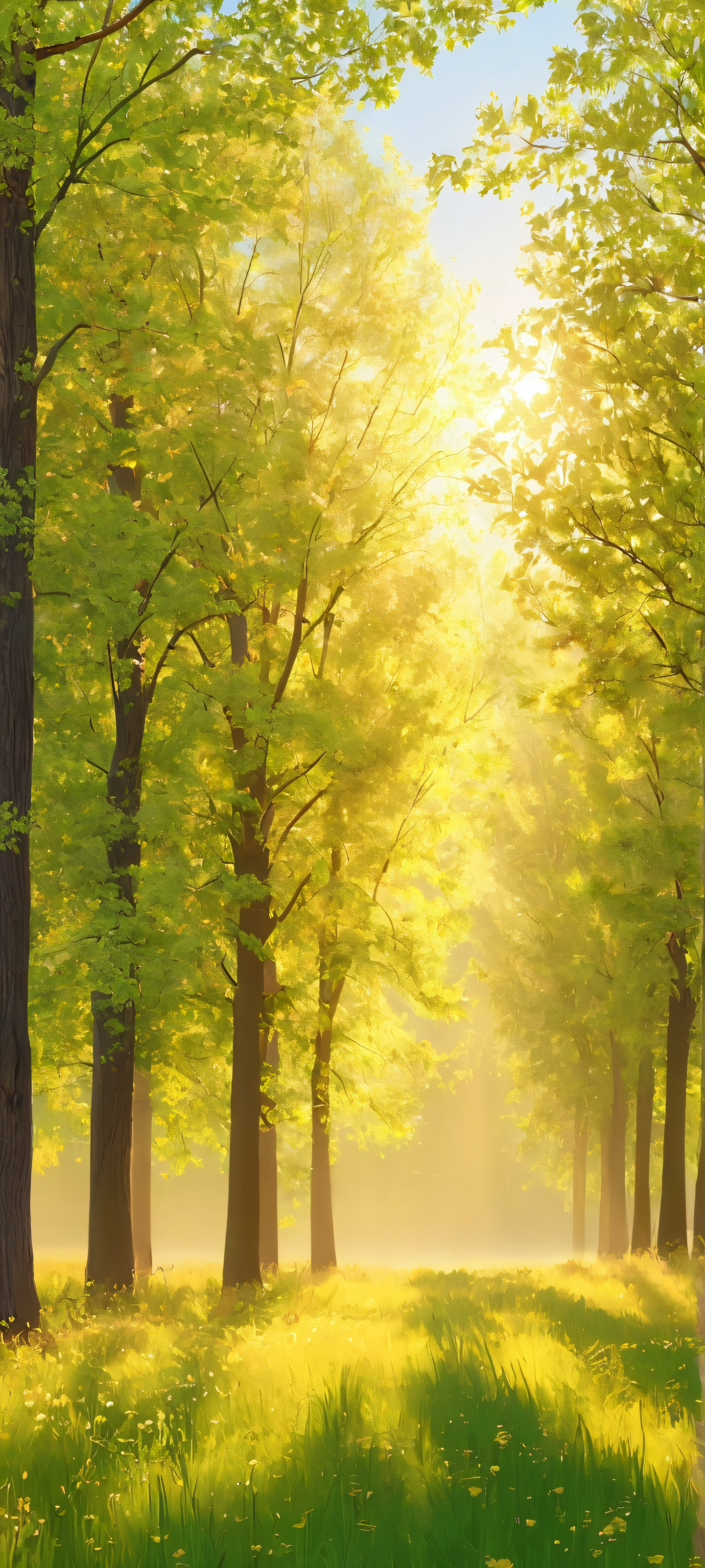 Indulge in the tranquil atmosphere of this stunning vertical mobile wallpaper, perfectly optimized for your iPhone, Samsung Galaxy, or Android home screen. Softly lit and highly detailed, this Impressionist-inspired masterpiece transports you to a serene meadow, where trees stand tall amidst warm sunlight.