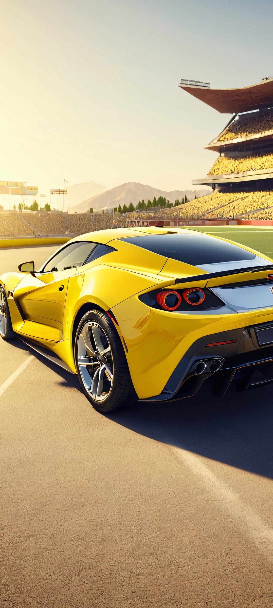 A yellow sports car speeding down the track on a sunny day, perfect for iPhone or Android home screens.