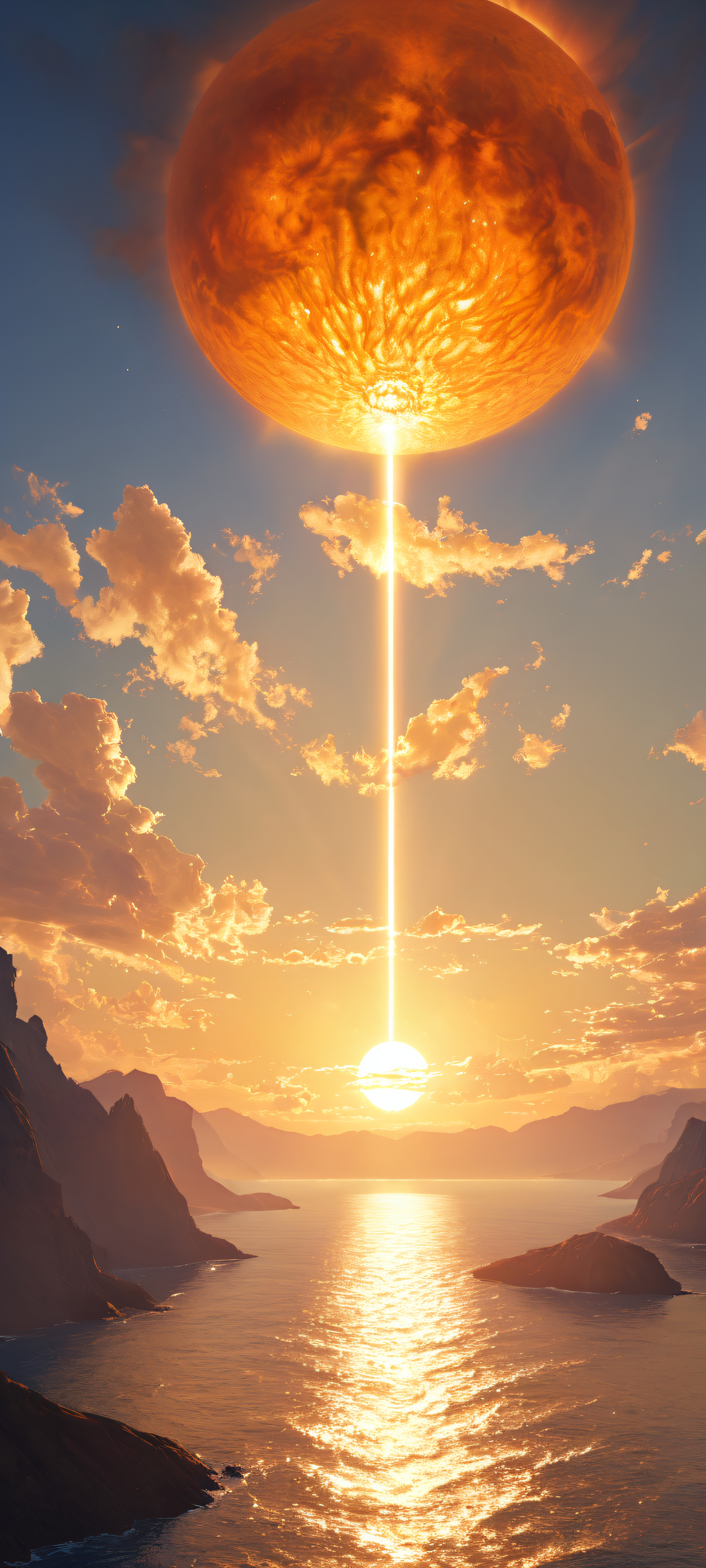A breathtaking vertical portrait artwork of Sun placed in the lower-middle with intricate micro-details of solar flares and coronal activity., Perfectly clean and empty top half with vast pure void, giving way to a breathtaking ultrawide landscape featuring clouds drifting lazily across the sky., Award-winning digital art with stunning visual impact, showcasing unparalleled levels of detail and pristine clarity., Ethereal lighting, where the warm glow of the setting Sun casts a radiant beam through the clouds, creating a sense of depth and dimensionality, with subtle ray-traced reflections adding an extra layer of realism., Dominant color palette features calming shades of golden yellow, soft whites, and gentle oranges, evoking feelings of serenity and peacefulness., ethereal lighting, radiant, brilliant colors, ray traced reflections, pristine clarity, portrait composition, centered subject in the lower middle, perfectly clean and smooth top half for UI, extreme depth of field blurred background, highly textured surfaces, intricate micro-details, physically based rendering, award-winning digital art, epic breathtaking scale, stunning visual impact, perfect composition, macOS wallpaper aesthetic, masterpiece, 2K QHD resolution, 9:20 aspect ratio.