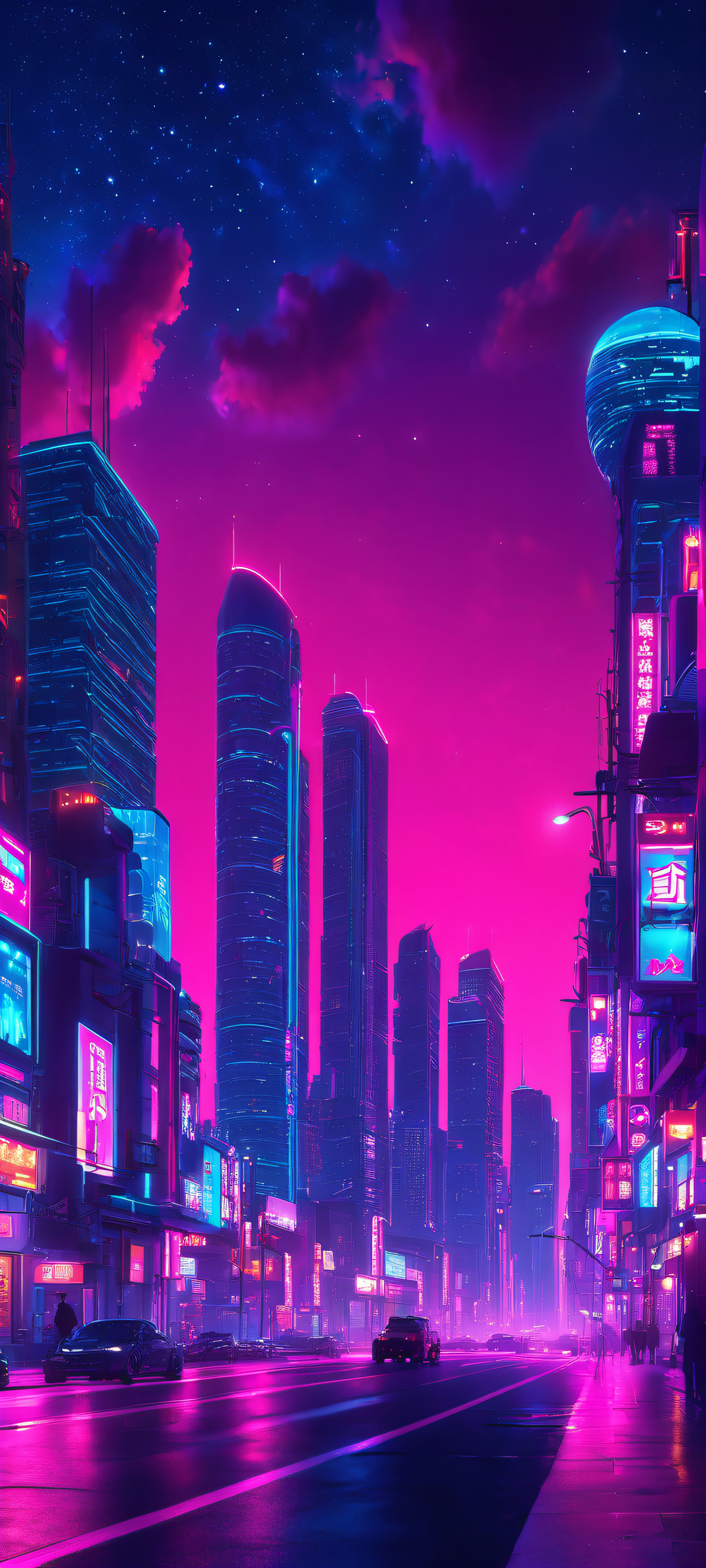 Step into a world of wonder with this stunning 2K QHD vertical mobile phone wallpaper, masterfully crafted to adorn your iPhone, Samsung Galaxy, or Android home screen. The artificial lighting creates a surreal ambiance, transporting you to a futuristic metropolis.