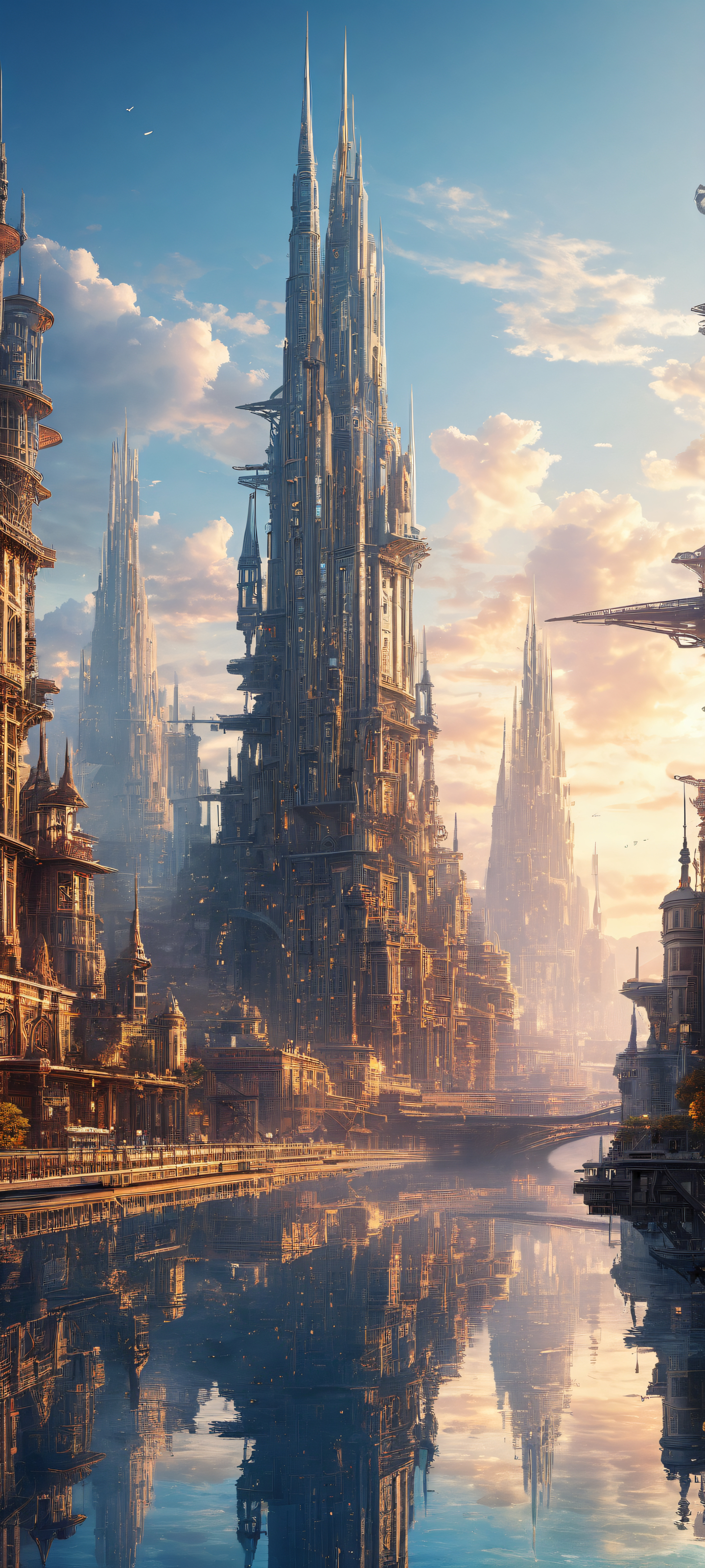 A breathtaking vertical portrait artwork of A surreal cityscape with towering structures placed in the lower-middle, intricate micro-details of gears and mechanisms., Perfectly clean and empty top half with vast pure void, allowing UI widgets to breathe comfortably. The bottom half transforms into an immersive cinematic cityscape., Award-winning digital art, stunning visual impact, pristine clarity, a symphony of creative design elements., Ethereal lighting with radiant, brilliant colors, ray traced reflections, and pristine clarity, evoking a sense of wonder and magic. Soft, diffused light pours in from above, gently illuminating the scene., Pastel hues with soft blues and purples, accented by warm golden tones, creating a whimsical and dreamy atmosphere., ethereal lighting, radiant, brilliant colors, ray traced reflections, pristine clarity, portrait composition, centered subject in the lower middle, perfectly clean and smooth top half for UI, extreme depth of field blurred background, highly textured surfaces, intricate micro-details, physically based rendering, award-winning digital art, epic breathtaking scale, stunning visual impact, perfect composition, macOS wallpaper aesthetic, masterpiece, 2K QHD resolution, 9:20 aspect ratio.