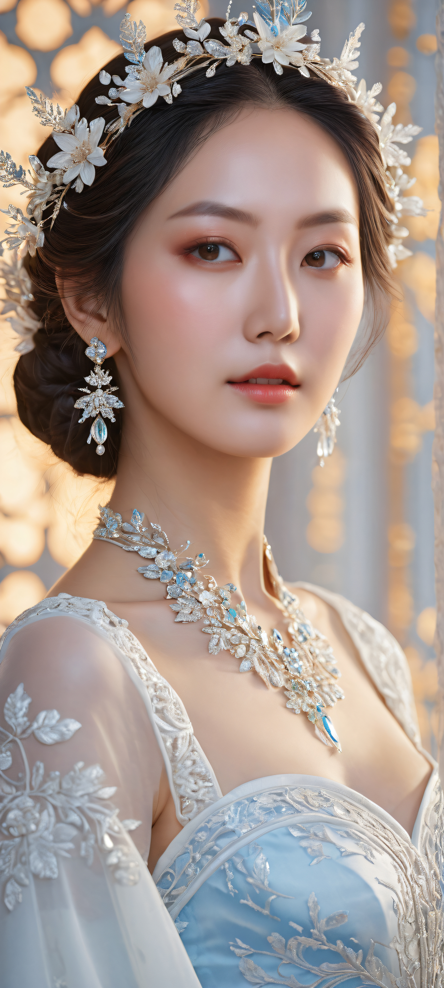 A breathtaking vertical portrait artwork of Suzuna, placed in the lower-middle with intricate micro-details of her hair ornament and outfit folds., A perfectly clean and empty top half with vast pure void, allowing UI widgets to breathe smoothly., Award-winning digital art, stunning visual impact, featuring a perfectly rendered 3D model, and pristine clarity., Ethereal lighting with radiant, brilliant colors, ray-traced reflections, and impeccable clarity, bathing Suzuna in a soft, gentle glow., Dominant palette of creamy whites (#F5F5F5), soft blues (#87CEEB), and subtle golds (#F8E231), evoking a sense of elegance and refinement., ethereal lighting, radiant, brilliant colors, ray traced reflections, pristine clarity, portrait composition, centered subject in the lower middle, perfectly clean and smooth top half for UI, extreme depth of field blurred background, highly textured surfaces, intricate micro-details, physically based rendering, award-winning digital art, epic breathtaking scale, stunning visual impact, perfect composition, macOS wallpaper aesthetic, masterpiece, 2K QHD resolution, 9:20 aspect ratio.