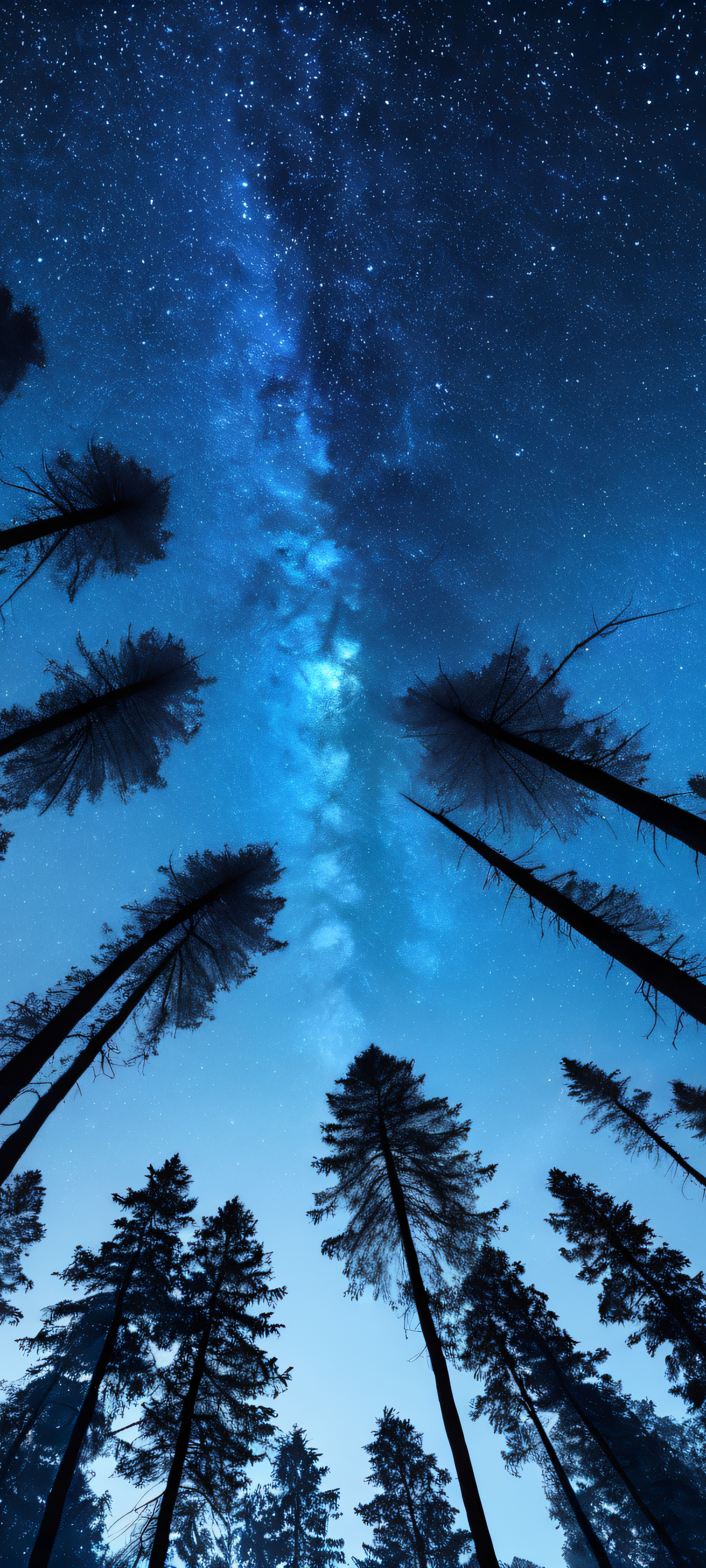 Elevate your mobile experience with this breathtaking vertical masterpiece. Perfectly optimized for iPhone, Samsung Galaxy, and Android home screens, this stunning image features towering trees set against the inky blackness of the night sky. The deep blues and soft whites evoke a sense of serenity and tranquility.