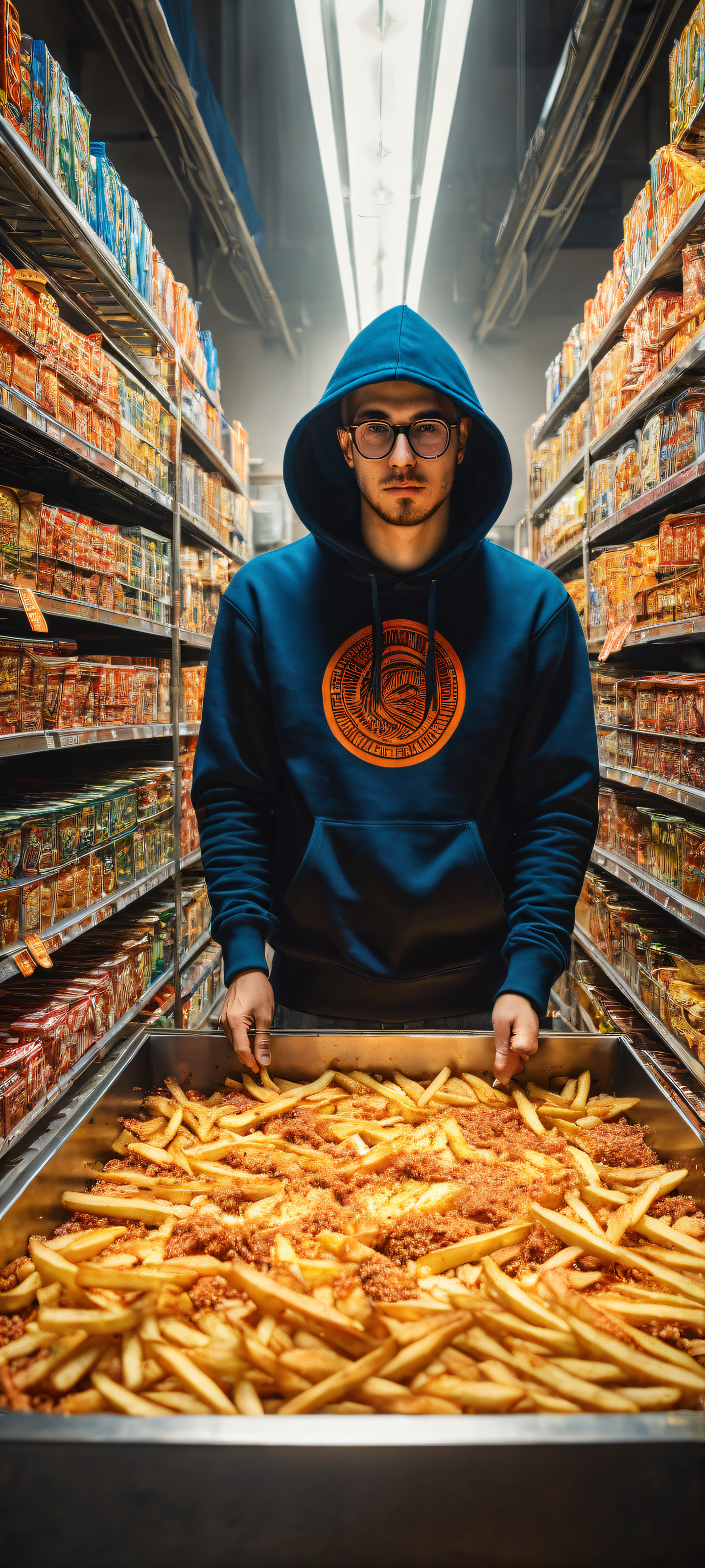 A breathtaking vertical portrait artwork of A bespectacled man in a black Civitai hoodie, placed in the lower-middle with insane micro-details, tripping and spilling a tray full of RAM sticks and GPUs all over the floor, amidst a scattering of fries., Perfectly clean and empty top half with vast pure void, allowing for an unobstructed view from above. Below, a mess of ram sticks and GPUs spills out in a chaotic yet realistic manner, punctuated by the occasional fry., Award-winning digital art, stunning visual impact, with a focus on texture and scale at Apple UI level. The image boasts pristine clarity and flawless execution., Ethereal lighting illuminates the scene, casting a warm glow over the entire environment. The light is soft and radiant, with subtle ray-traced reflections adding depth and dimensionality to the image., Dominant colors include a palette of earthy tones such as beige, brown, and gray, punctuated by bursts of bright orange from the spilled fries and vibrant blue from the man’s hoodie., ethereal lighting, radiant, brilliant colors, ray traced reflections, pristine clarity, portrait composition, centered subject in the lower middle, perfectly clean and smooth top half for UI, extreme depth of field blurred background, highly textured surfaces, intricate micro-details, physically based rendering, award-winning digital art, epic breathtaking scale, stunning visual impact, perfect composition, macOS wallpaper aesthetic, masterpiece, 2K QHD resolution, 9:20 aspect ratio.
