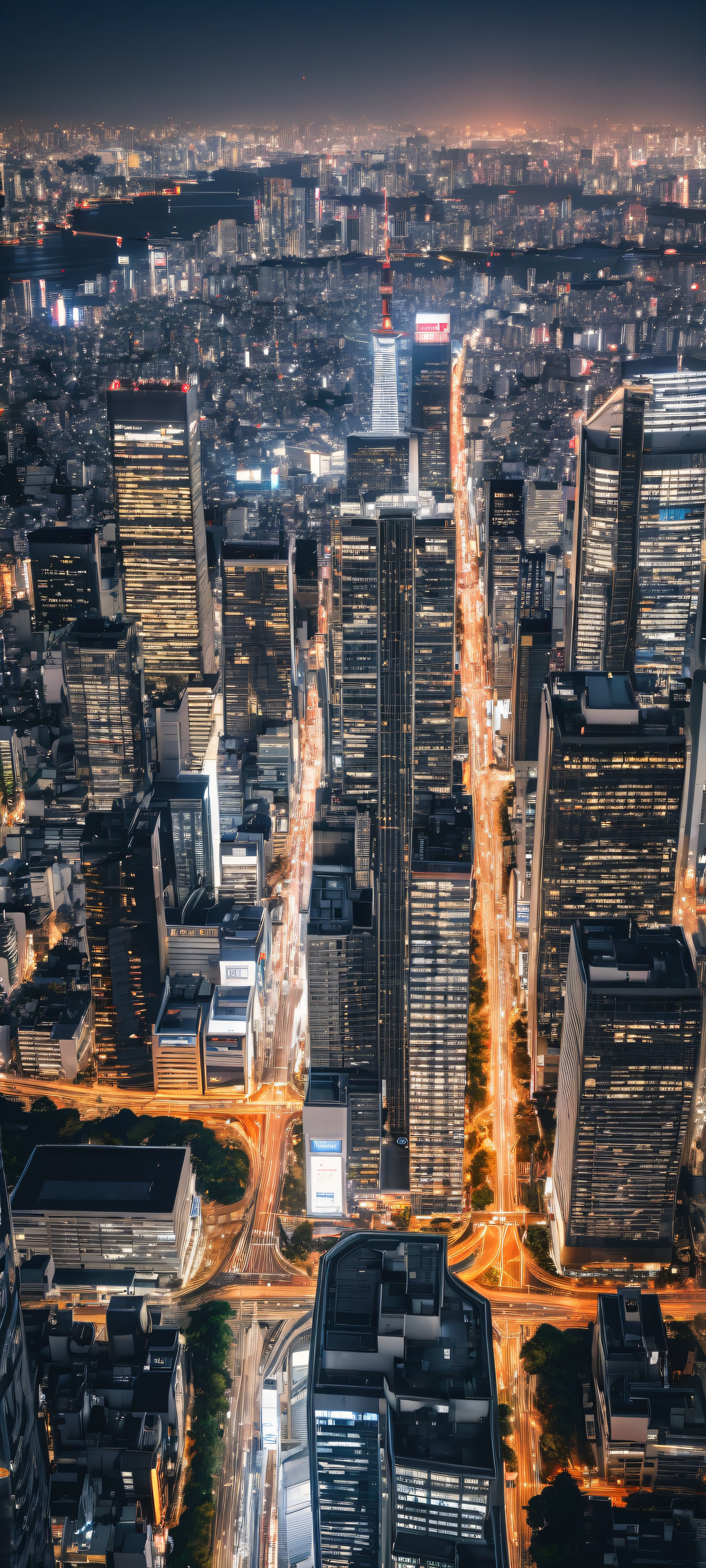 A breathtaking vertical portrait artwork of A majestic Tokyo cityscape placed in the lower-middle with insane micro-details on a towering skyscraper, set against the radiant night sky., A perfectly clean and empty top half with vast pure void, allowing for seamless integration of UI widgets., Award-winning digital art, stunning visual impact, and pristine clarity at 8k resolution, with a 16:9 aspect ratio, perfect for an epic desktop wallpaper., Ethereal lighting captures the essence of Tokyo’s night sky, with glowing skyscrapers and city lights reflected in the dark expanse, creating a sense of depth and mystery., #3498DB #FFC107 #333333, ethereal lighting, radiant, brilliant colors, ray traced reflections, pristine clarity, portrait composition, centered subject in the lower middle, perfectly clean and smooth top half for UI, extreme depth of field blurred background, highly textured surfaces, intricate micro-details, physically based rendering, award-winning digital art, epic breathtaking scale, stunning visual impact, perfect composition, macOS wallpaper aesthetic, masterpiece, 2K QHD resolution, 9:20 aspect ratio.