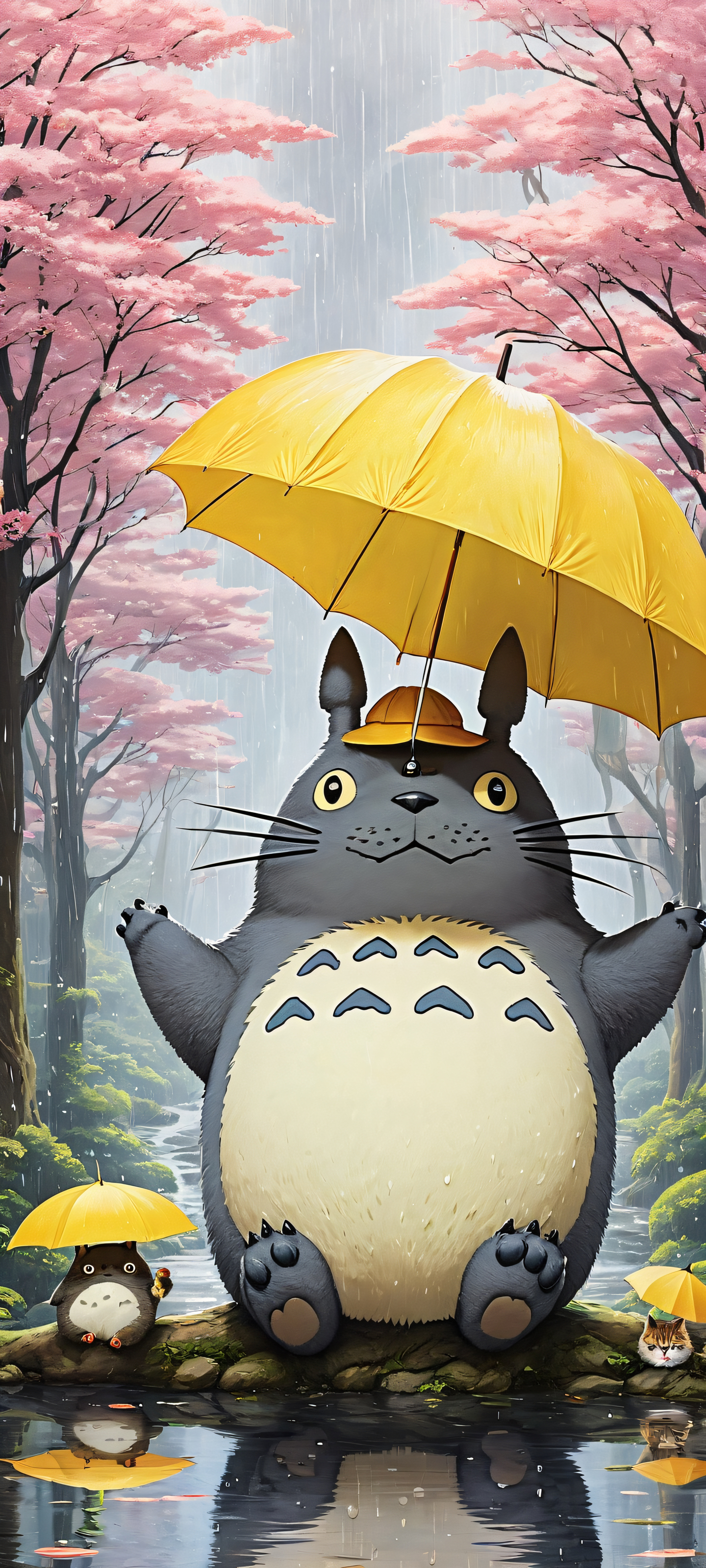 A breathtaking vertical portrait artwork of Totoro and friends, placed in the lower-middle with intricate micro-details of tiger’s fur, rain-soaked boots, and yellow umbrella, Perfectly clean and empty top half with vast pure void, gradually transitioning to a dramatic rainstorm scene featuring cats, demon hunters, and KPop-inspired elements in the lower half, Award-winning digital art, stunning visual impact, and pristine clarity, reminiscent of a masterpiece, Ethereal lighting with radiant, brilliant colors, ray-traced reflections, and a sense of depth, as if lit by an otherworldly force, A palette of pastel pink, yellow, white, and gray, evoking a whimsical and dreamlike atmosphere, ethereal lighting, radiant, brilliant colors, ray traced reflections, pristine clarity, portrait composition, centered subject in the lower middle, perfectly clean and smooth top half for UI, extreme depth of field blurred background, highly textured surfaces, intricate micro-details, physically based rendering, award-winning digital art, epic breathtaking scale, stunning visual impact, perfect composition, macOS wallpaper aesthetic, masterpiece, 2K QHD resolution, 9:20 aspect ratio.
