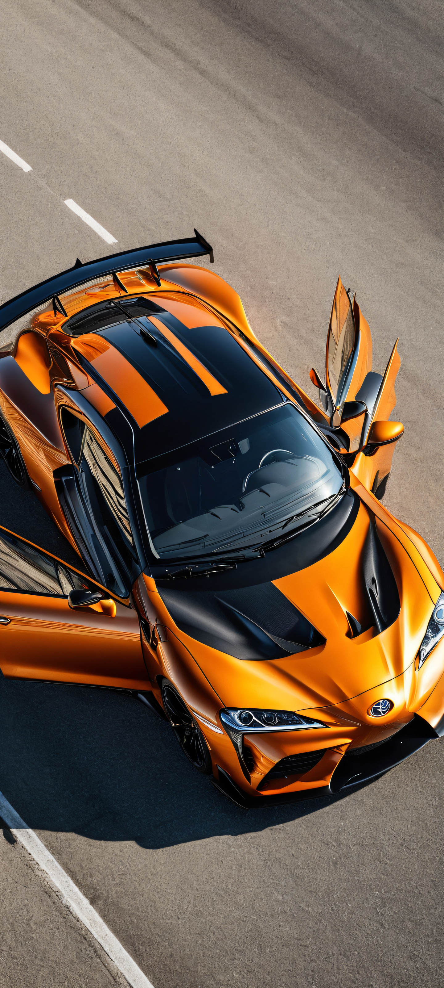 A breathtaking vertical portrait artwork of Toyota GR010 Hybrid placed in the lower-middle, intricate micro-details showcasing its sleek design and futuristic features, A perfectly clean and empty top half with vast pure void, allowing for a stunning visual contrast between the background and the foreground, Award-winning digital art, pristine clarity, with a focus on hyper-realism to emphasize the car’s speed and agility, Ethereal lighting with radiant highlights, soft shadows, and a touch of warmth to evoke a sense of excitement and energy, #FFC080 #F7D2C4 #8B9467 (Warm orange-yellow tones with hints of cool grey, evoking the sensation of speed and movement), ethereal lighting, radiant, brilliant colors, ray traced reflections, pristine clarity, portrait composition, centered subject in the lower middle, perfectly clean and smooth top half for UI, extreme depth of field blurred background, highly textured surfaces, intricate micro-details, physically based rendering, award-winning digital art, epic breathtaking scale, stunning visual impact, perfect composition, macOS wallpaper aesthetic, masterpiece, 2K QHD resolution, 9:20 aspect ratio.