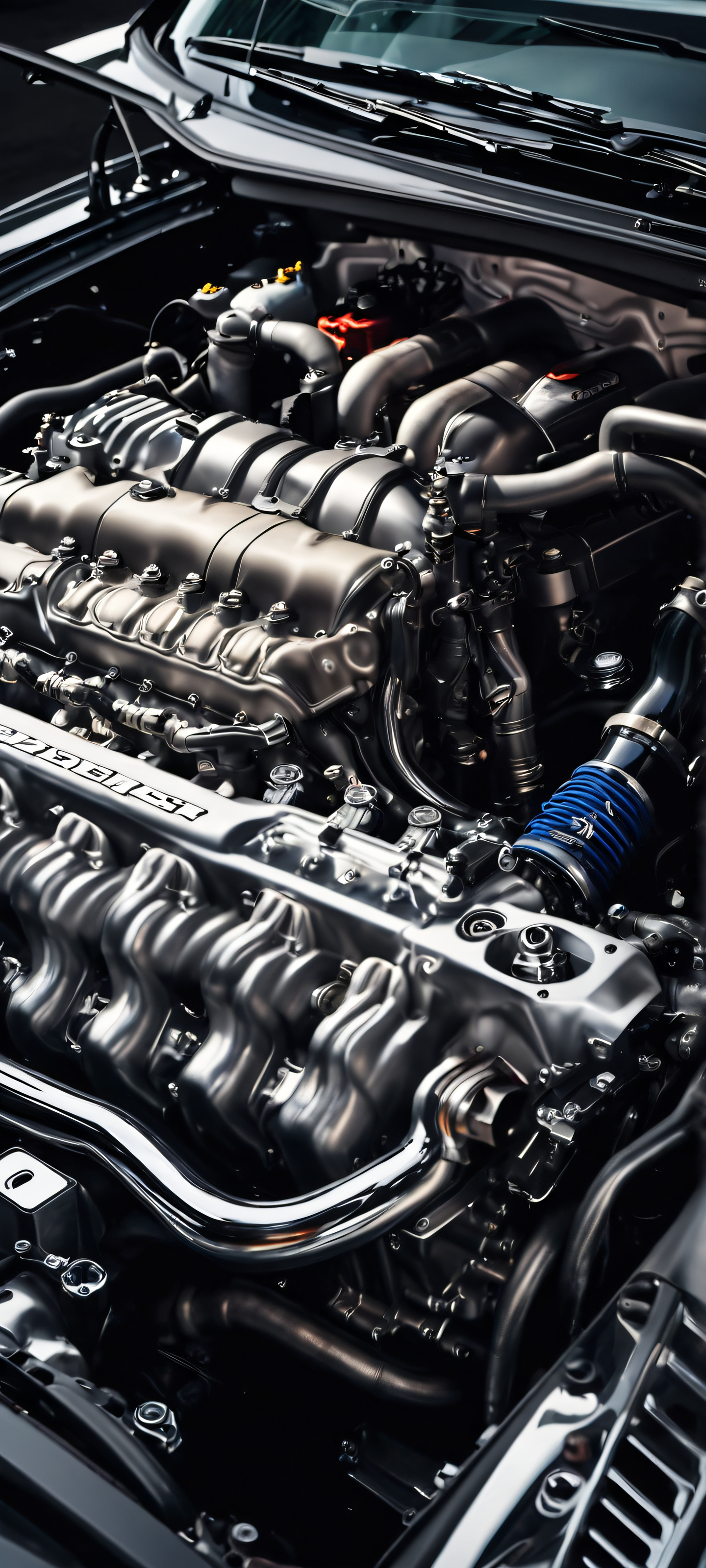 Explore the intricate details of a car engine bay in this stunning vertical mobile wallpaper, perfect for your iPhone/Android home screen.
