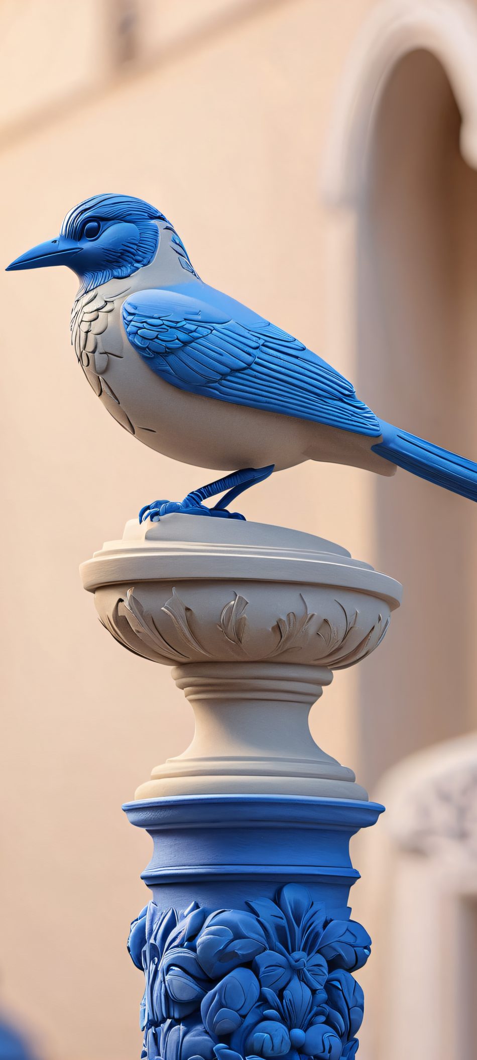 Elevate your mobile phone’s home screen with this breathtaking 2K QHD masterpiece. A realistic depiction of a bird statue, set against a warm beige, soft gray, and vibrant blue urban backdrop. This highly detailed and highest quality image is designed specifically for iPhone, Samsung Galaxy, and Android devices, ensuring a flawless display of its beauty.