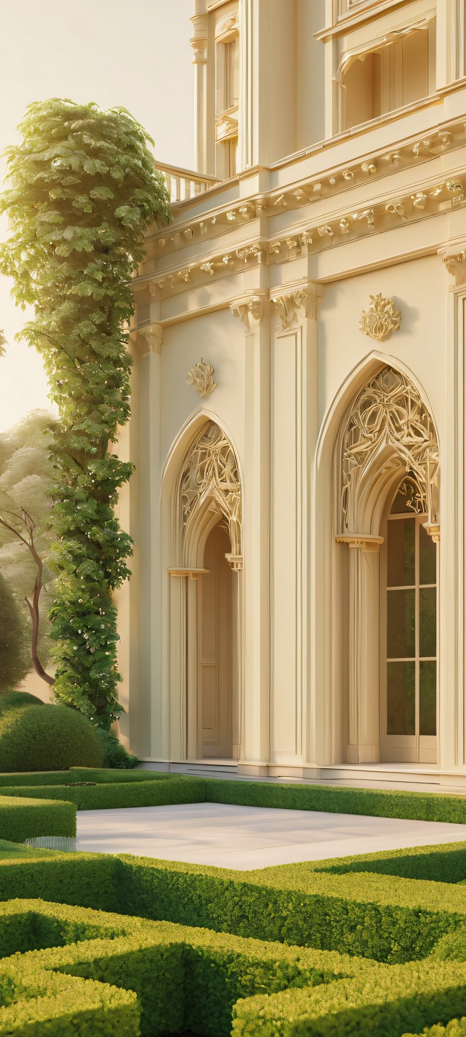 Elevate your mobile experience with this stunning 2K QHD masterpiece, optimized for iPhone, Samsung Galaxy, and Android home screens. Perfectly captured in a soft golden light, this breathtaking urban oasis features lush greenery, beige, and cream tones, creating a sense of tranquility and serenity.