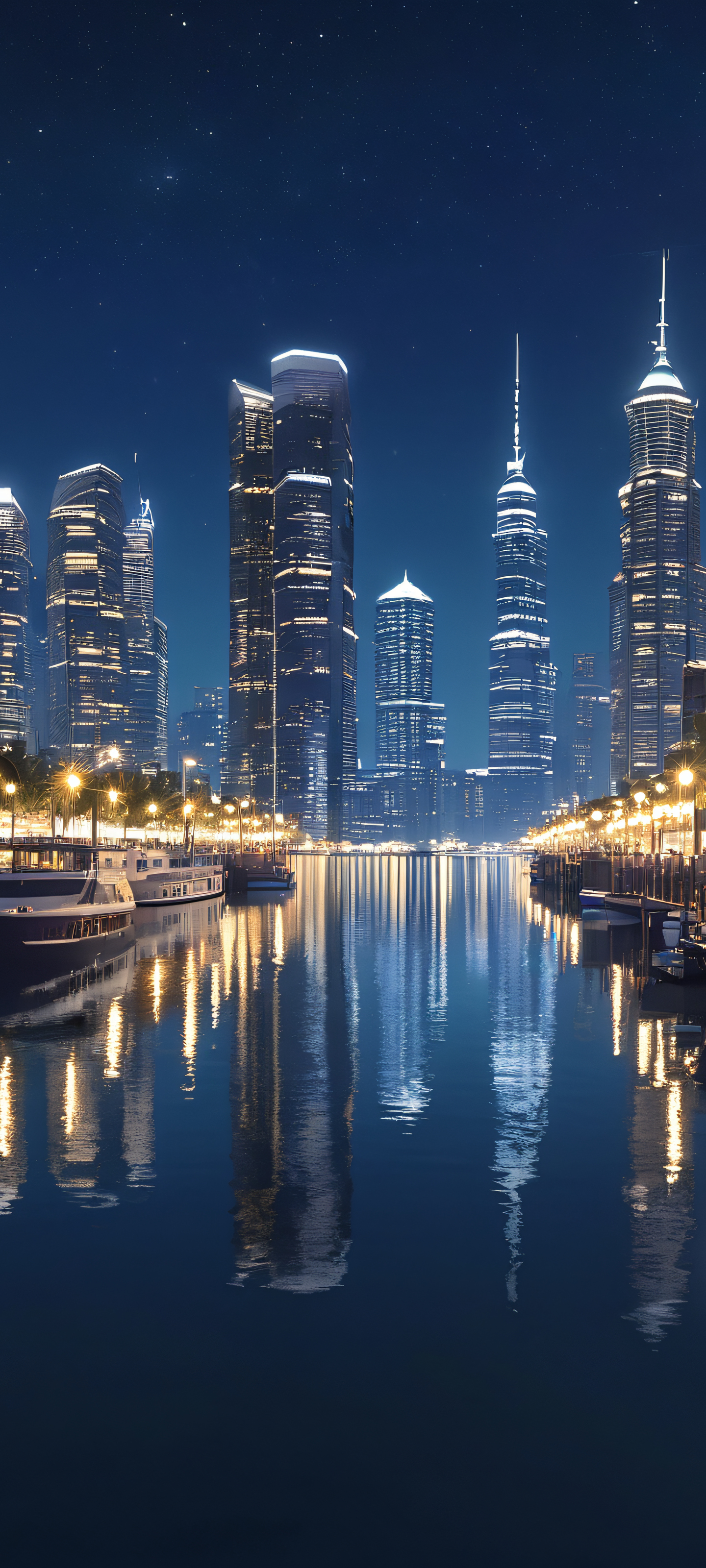 A stunning cityscape of a waterfront area at night, with vibrant blues, greys, and whites reflecting off the water's surface, perfectly suited for your iPhone or Android.