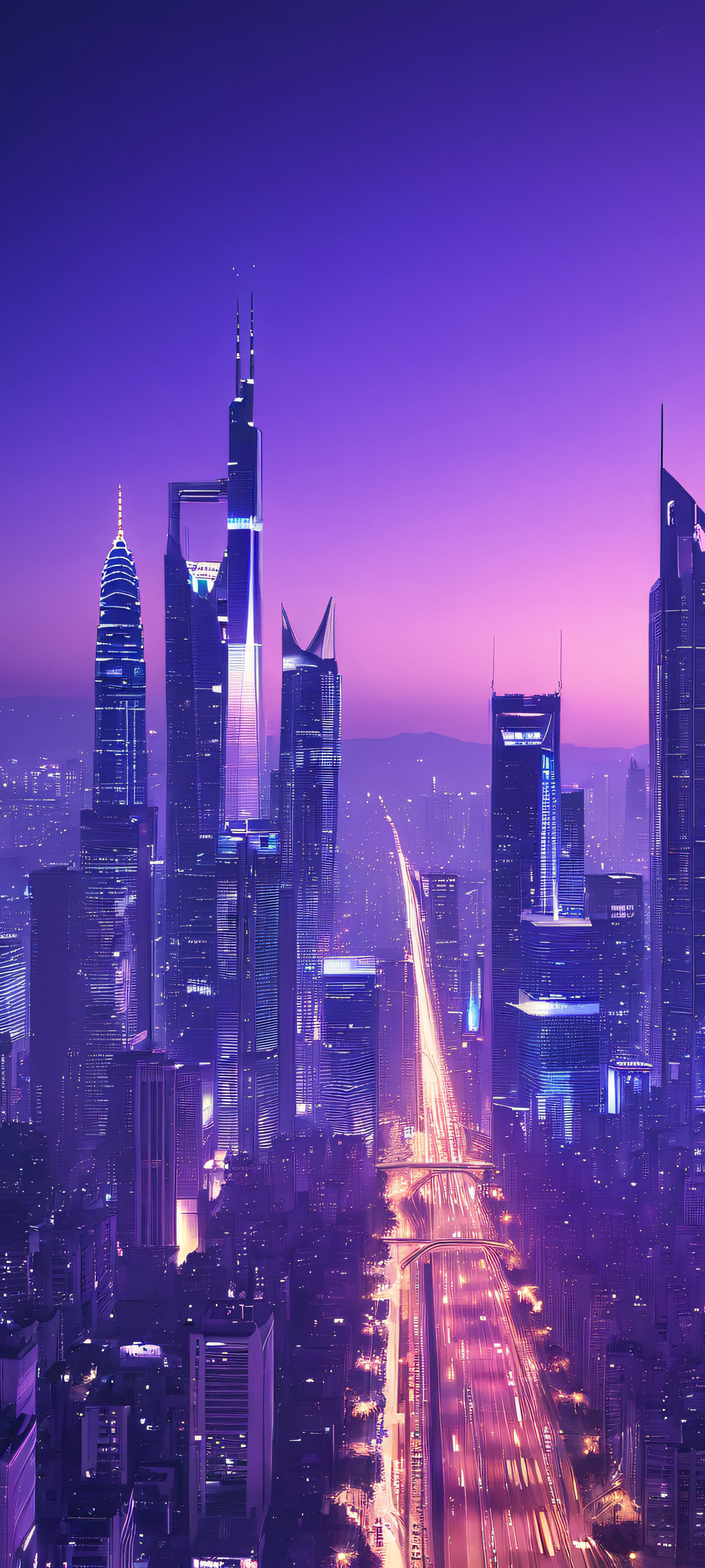 Experience the serenity of the urban jungle with this stunning city skyline wallpaper. Softly lit and highly detailed, this masterpiece is perfectly optimized for your iPhone, Samsung Galaxy, or Android home screen, ensuring a breathtaking display of blues and purples.