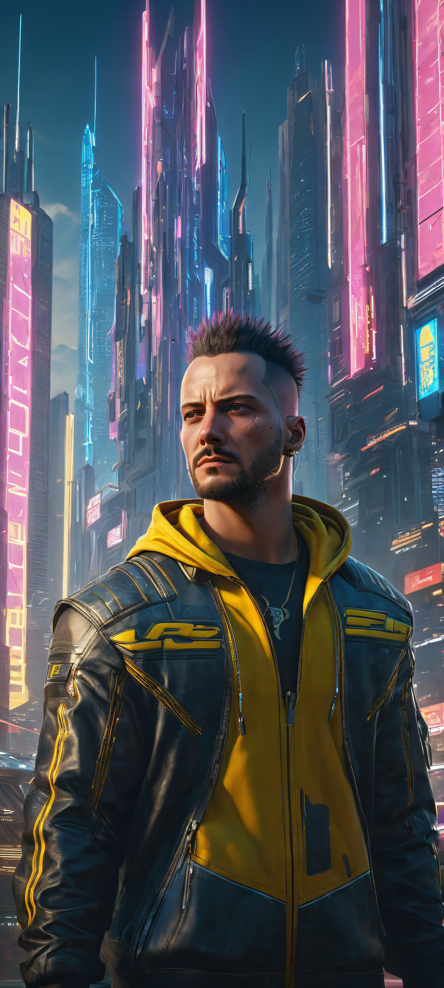 Perfectly optimized for iPhone, Samsung Galaxy, and Android home screens, this breathtaking artwork features V in a stunning vertical portrait. The clean top half provides a pristine backdrop for UI elements, while the bottom half transports you to a futuristic cityscape with intricate details and ray-traced reflections. The ethereal lighting casts vibrant rays across V’s cybernetic enhancements, highlighting their intricate design.
