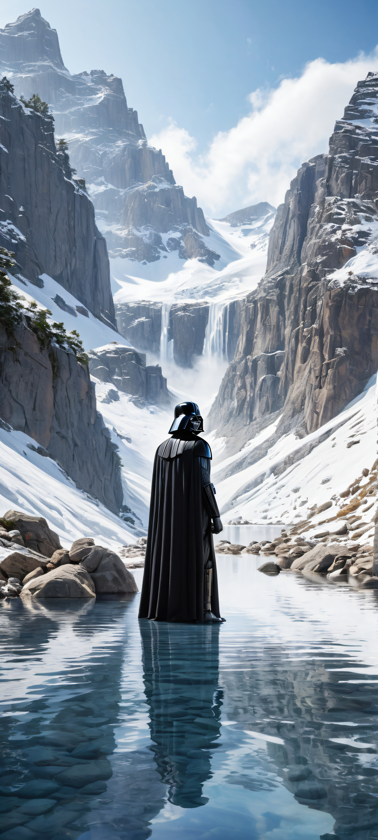 A breathtaking vertical portrait artwork of Darth Vader placed in the lower-middle, intricate micro-details of a partially submerged hot spring amidst the snowy mountainside., Perfectly clean and empty top half with vast pure void, allowing for a seamless blend with the serene atmosphere., Award-winning digital art, stunning visual impact with pristine clarity and an emphasis on texture and scale at Apple UI level., Ethereal lighting with radiant, brilliant colors, ray-traced reflections, and impeccable clarity, evoking a sense of tranquility., A dominant palette of calming whites, soft blues, and subtle grays, capturing the essence of a serene hot spring on a snowy mountain morning., ethereal lighting, radiant, brilliant colors, ray traced reflections, pristine clarity, portrait composition, centered subject in the lower middle, perfectly clean and smooth top half for UI, extreme depth of field blurred background, highly textured surfaces, intricate micro-details, physically based rendering, award-winning digital art, epic breathtaking scale, stunning visual impact, perfect composition, macOS wallpaper aesthetic, masterpiece, 2K QHD resolution, 9:20 aspect ratio.