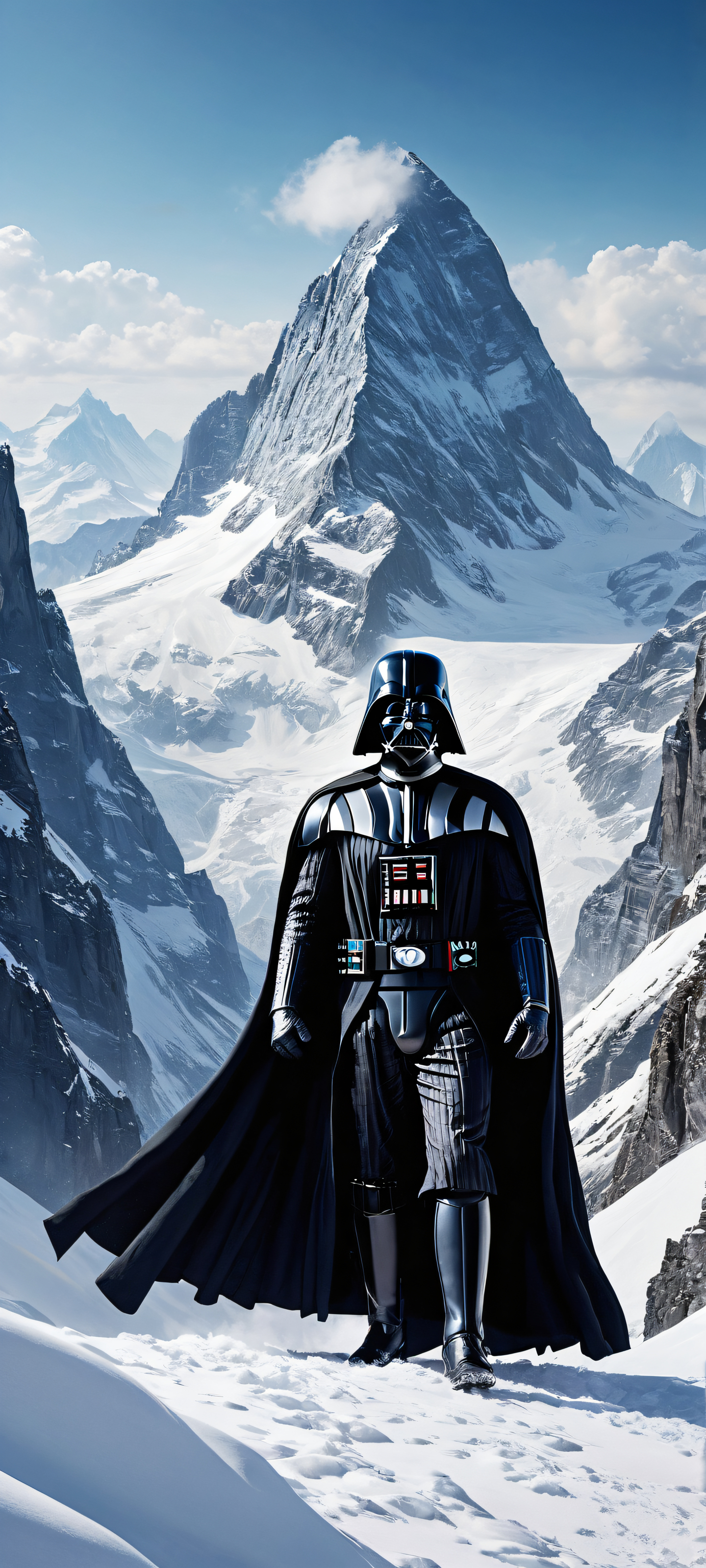 A breathtaking vertical portrait artwork of Darth Vader, placed in the lower-middle, intricate micro-details of a partially submerged mountain peak, Perfectly clean and empty top half with vast pure void, allowing for seamless integration of UI widgets, surrounded by serene snow-capped mountains, Award-winning digital art, pristine clarity, showcasing breathtaking vistas and majestic forms, Sleek Dark Mode aesthetic, featuring deep perfect blacks, striking crisp contrast, and elegant luminescent accents on the snow and Vader’s helmet, Dominant blue and white palette, evoking feelings of serenity and isolation in the frozen wilderness, elegant low-key lighting, deep perfect blacks, striking contrast, sleek dark mode aesthetic, luminescent accents, deep rich colors, portrait composition, centered subject in the lower middle, perfectly clean and smooth top half for UI, extreme depth of field blurred background, highly textured surfaces, intricate micro-details, physically based rendering, award-winning digital art, epic breathtaking scale, stunning visual impact, perfect composition, macOS wallpaper aesthetic, masterpiece, 2K QHD resolution, 9:20 aspect ratio.