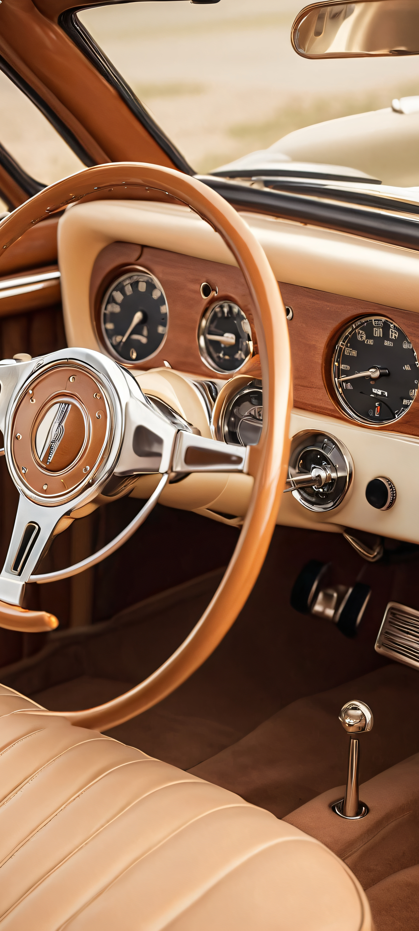 Elevate your mobile home screen with this breathtaking 2K QHD masterpiece of a vintage car dashboard. Expertly crafted to perfectly optimize for iPhone, Samsung Galaxy, and Android devices, this stunning wallpaper is sure to transport you back in time. Let the warm beige, rich brown, and creamy white tones immerse you in a nostalgic atmosphere.