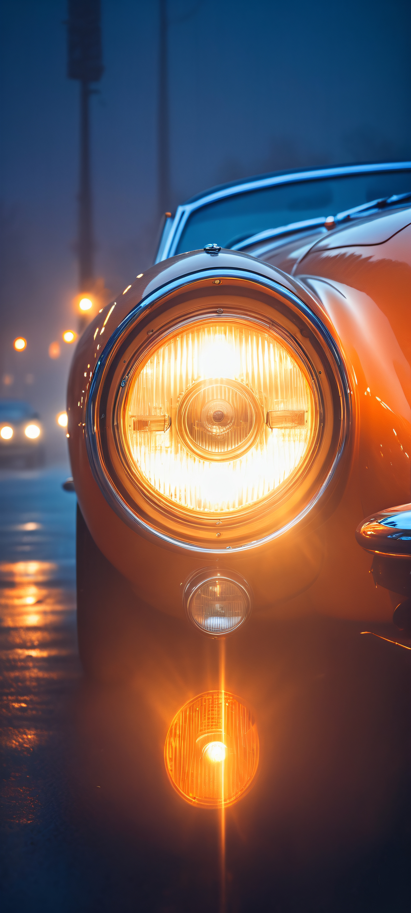 iPhone and Android users will love this breathtaking vertical mobile phone wallpaper featuring vintage car headlights shining brightly on a foggy night with warm orange and deep blue hues.