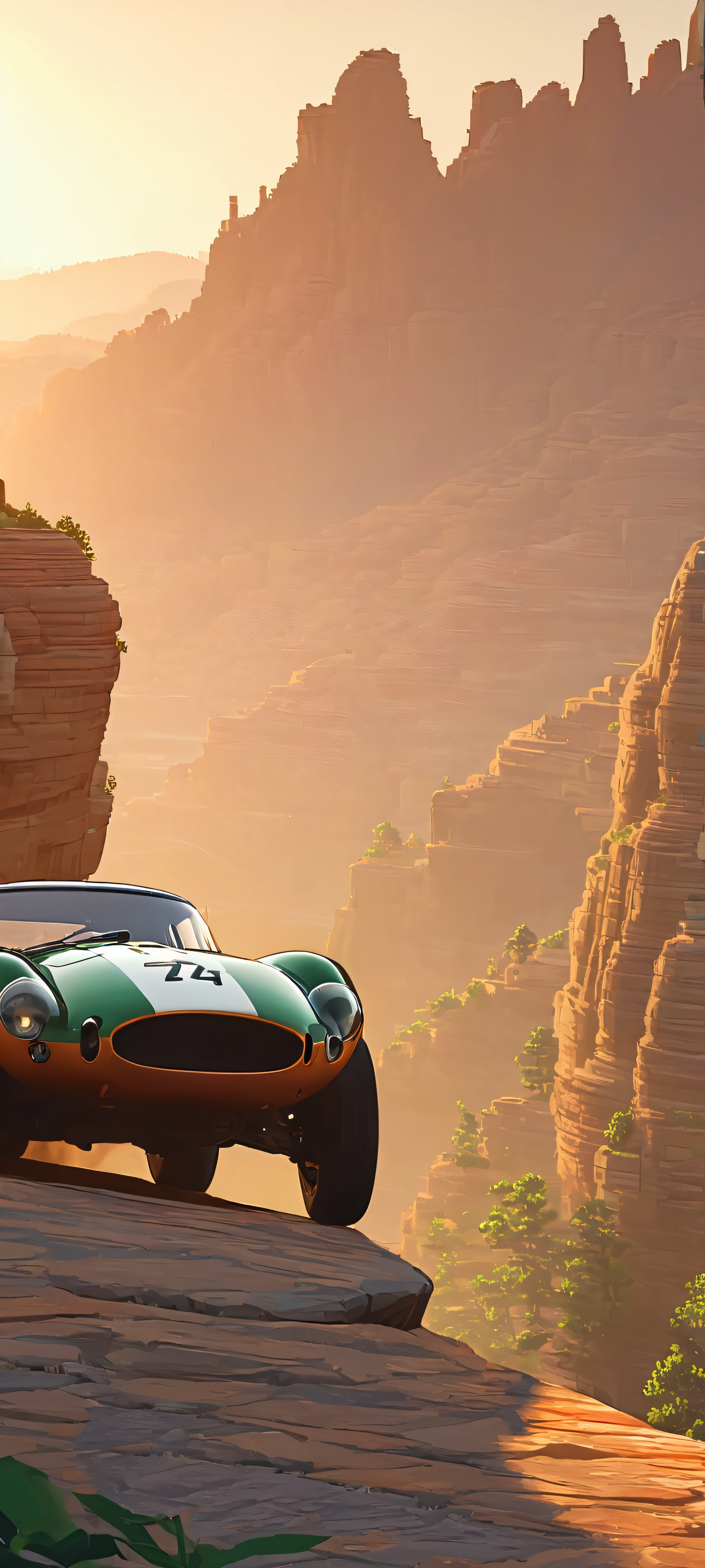 iPhone and Android users, get ready to rev up your home screen with this stunning vintage racing car amidst a city on a rocky formation at dusk, bathed in warm sunlight.