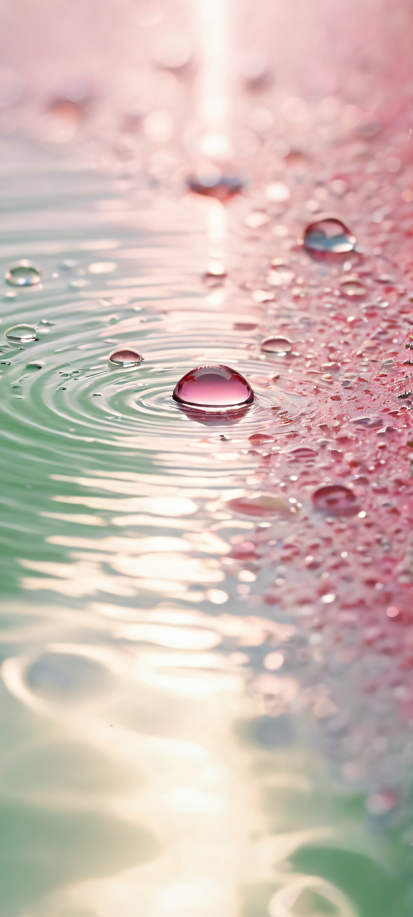 Elevate your mobile home screen with this breathtaking vertical portrait of water drops, perfectly optimized for iPhone, Samsung Galaxy, and Android devices. The clean and empty top half allows for seamless integration of UI widgets, while the radiant pink undertones and soft green tones evoke a sense of serenity and tranquility.