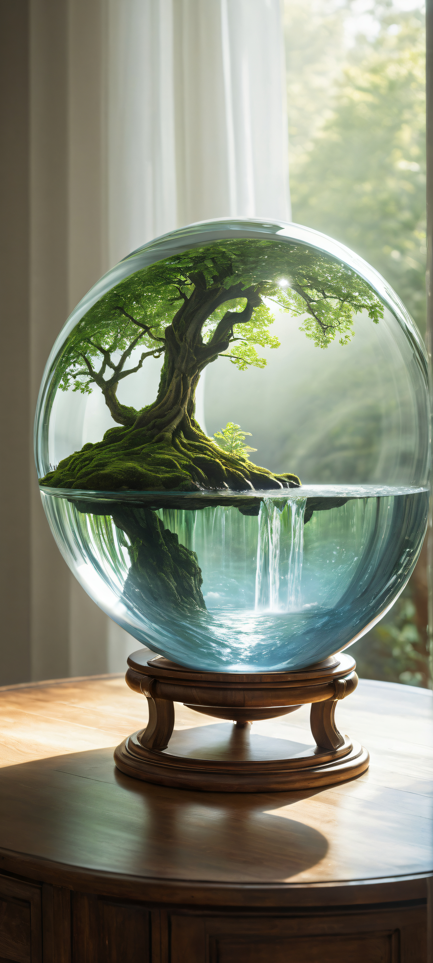 A breathtaking vertical portrait artwork of A serene waterfall scene placed in the lower-middle, intricate micro-details showcasing the rippling effects on the crystal ball and the worn wooden table., The room features a perfectly clean and empty top half with vast pure void, allowing for an unobstructed view of the waterfall’s majesty. The worn wooden table serves as a natural anchor to the scene., Award-winning digital art, pristine clarity, with a focus on capturing the ethereal atmosphere of the mystifying scene. The subject is rendered in stunning visual impact., Ethereal lighting shines upon the scene, casting a soft glow on the crystal ball and the water as it pours into the room, creating an atmosphere of serenity and mystique., Soft blues, misty whites, and subtle greens dominate the palette, evoking a sense of calmness and wonder., ethereal lighting, radiant, brilliant colors, ray traced reflections, pristine clarity, portrait composition, centered subject in the lower middle, perfectly clean and smooth top half for UI, extreme depth of field blurred background, highly textured surfaces, intricate micro-details, physically based rendering, award-winning digital art, epic breathtaking scale, stunning visual impact, perfect composition, macOS wallpaper aesthetic, masterpiece, 2K QHD resolution, 9:20 aspect ratio.