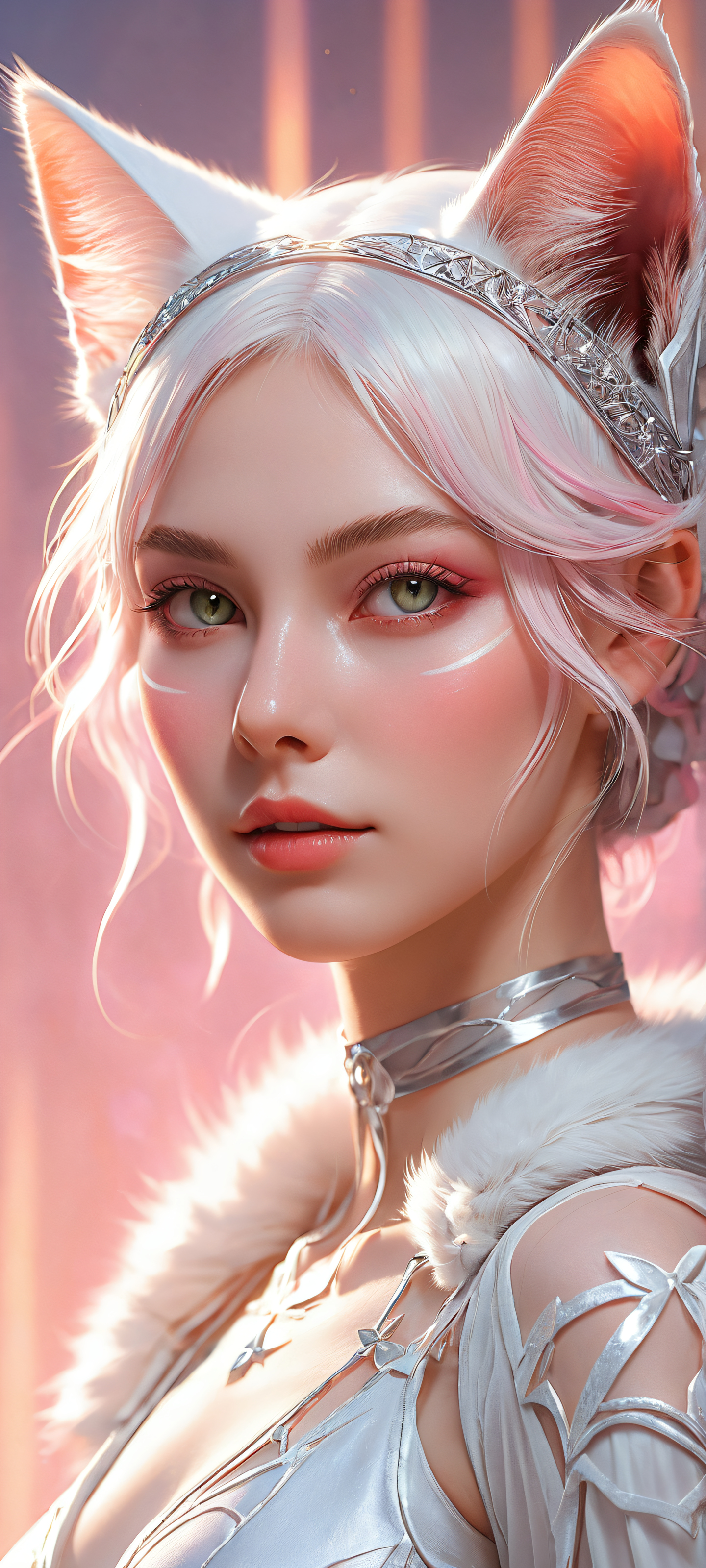 A breathtaking vertical portrait artwork of Cat Girl placed in the lower-middle, intricate micro-details of cat ears and whiskers., Perfectly clean and empty top half with vast pure void, allowing for seamless integration with UI widgets., Award-winning digital art, pristine clarity, with bold lines and vibrant colors reminiscent of a masterpiece., Ethereal lighting with soft, gentle rays casting a warm glow on the cat girl’s features, creating an otherworldly ambiance., Dominant colors of pastel pink, creamy white, and soft gray, evoking a sense of whimsy and wonder., ethereal lighting, radiant, brilliant colors, ray traced reflections, pristine clarity, portrait composition, centered subject in the lower middle, perfectly clean and smooth top half for UI, extreme depth of field blurred background, highly textured surfaces, intricate micro-details, physically based rendering, award-winning digital art, epic breathtaking scale, stunning visual impact, perfect composition, macOS wallpaper aesthetic, masterpiece, 2K QHD resolution, 9:20 aspect ratio.