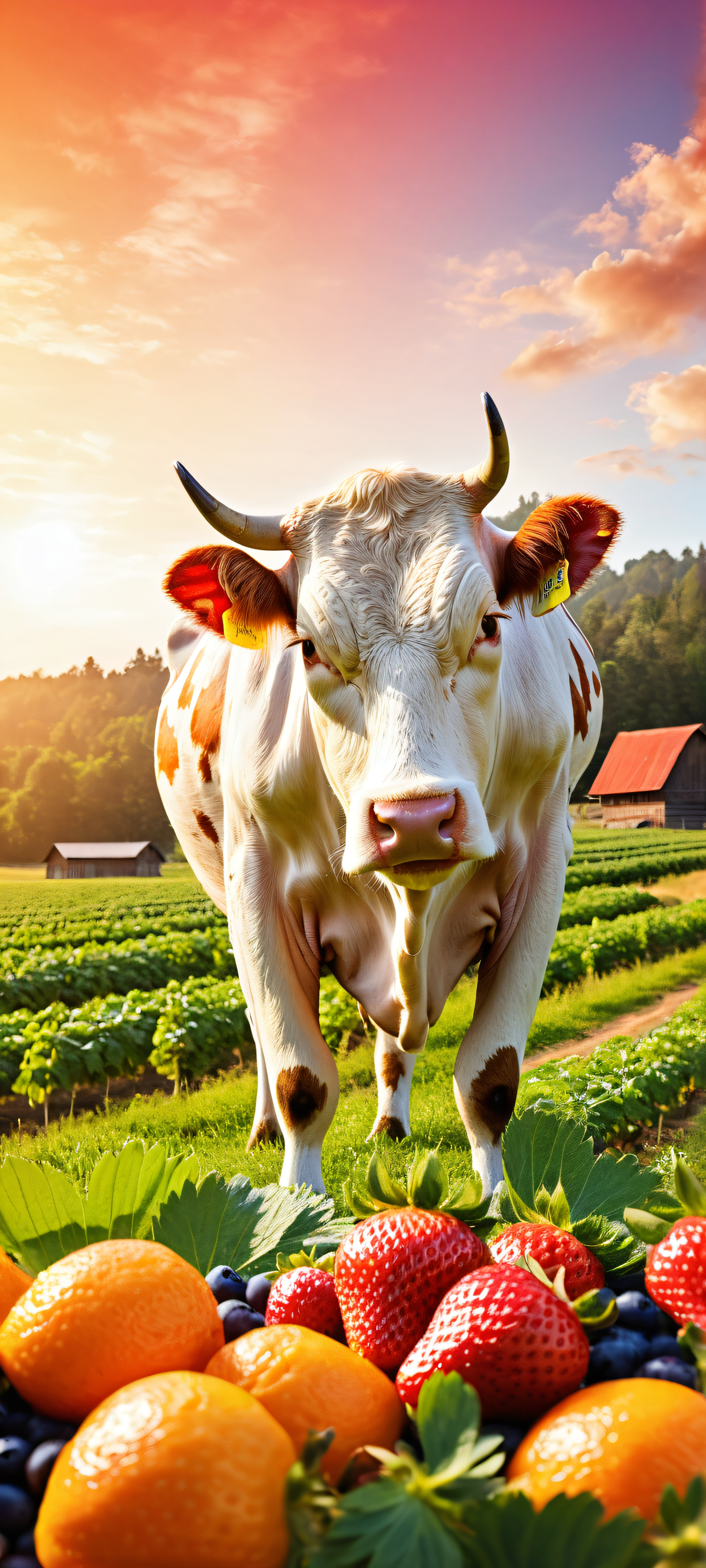 A breathtaking vertical portrait artwork of A cow-sized strawberry, orange, and blueberry placed in the lower-middle with intricate micro-details of their utters getting milked by a farmer in overalls and a straw hat., A perfectly clean and empty top half with a vast pure void, allowing for unobstructed UI breathing space, Award-winning digital art with stunning visual impact, perfectly blending texture and scale to create a visually captivating masterpiece, Ethereal lighting with radiant, brilliant colors, showcasing ray-traced reflections and pristine clarity, giving the impression of being bathed in warm sunlight, Dominant pink and creamy white hues, evoking feelings of whimsy and playfulness, while also hinting at the sweetness and nourishment provided by these fruits, ethereal lighting, radiant, brilliant colors, ray traced reflections, pristine clarity, portrait composition, centered subject in the lower middle, perfectly clean and smooth top half for UI, extreme depth of field blurred background, highly textured surfaces, intricate micro-details, physically based rendering, award-winning digital art, epic breathtaking scale, stunning visual impact, perfect composition, macOS wallpaper aesthetic, masterpiece, 2K QHD resolution, 9:20 aspect ratio.