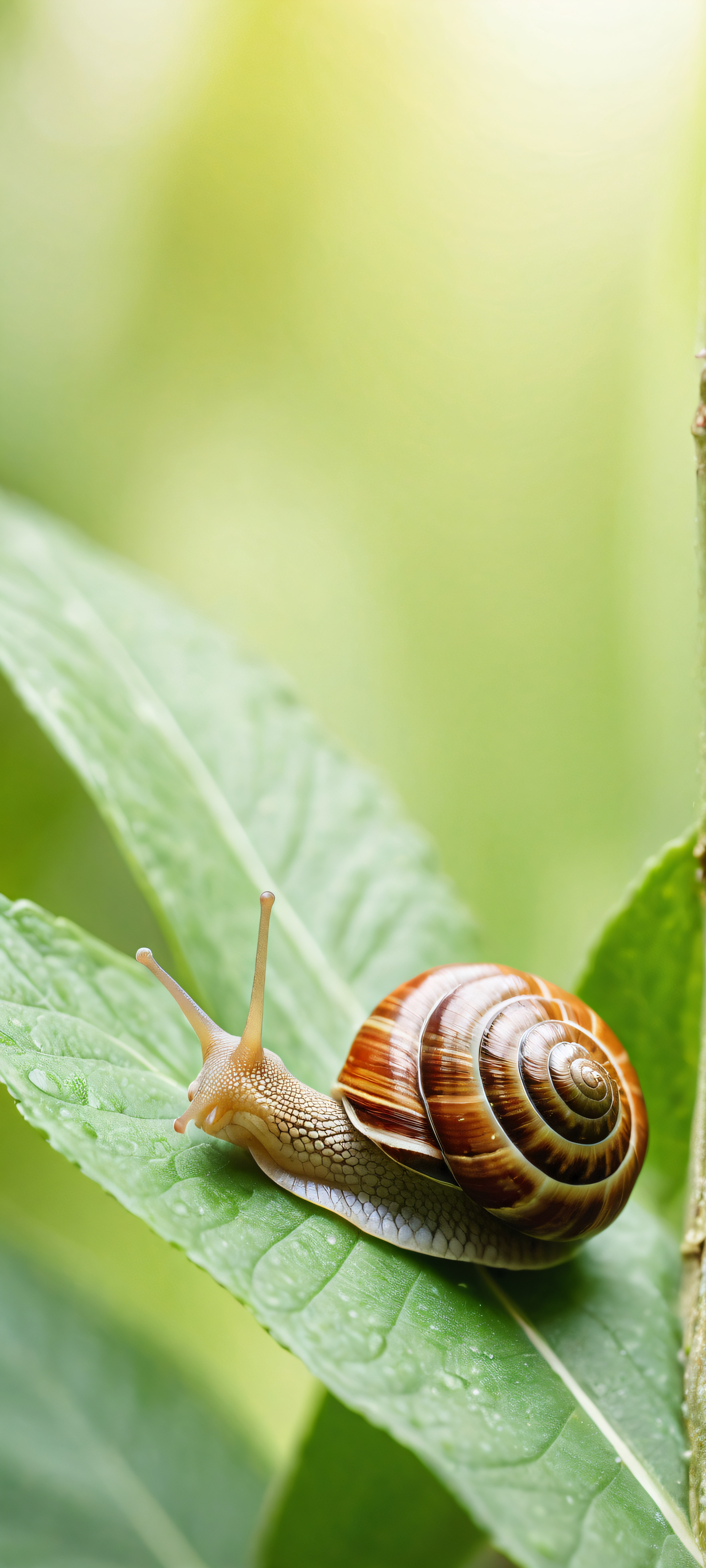 A serene iPhone/Android wallpaper featuring a snail's intricate shell amidst lush greenery, showcasing exquisite detail and ethereal lighting.