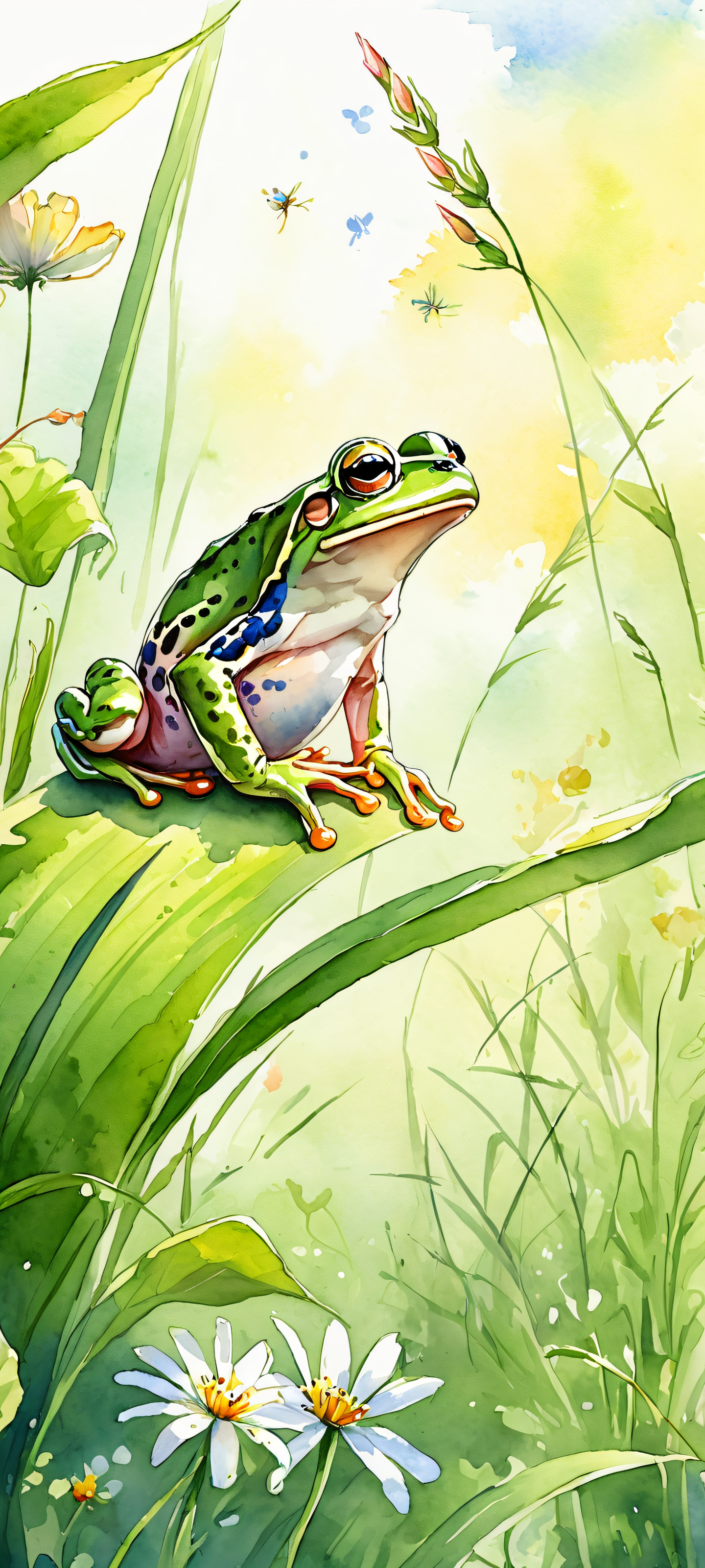 Elevate your mobile home screen with this stunning 2K QHD wallpaper. Perfectly optimized for iPhone, Samsung Galaxy, and Android devices, this artwork brings the tranquility of nature to your fingertips. Enjoy the gentle daylight ambiance, intricate details, and vibrant colors of a beautiful meadow scene featuring a charming frog illustration.