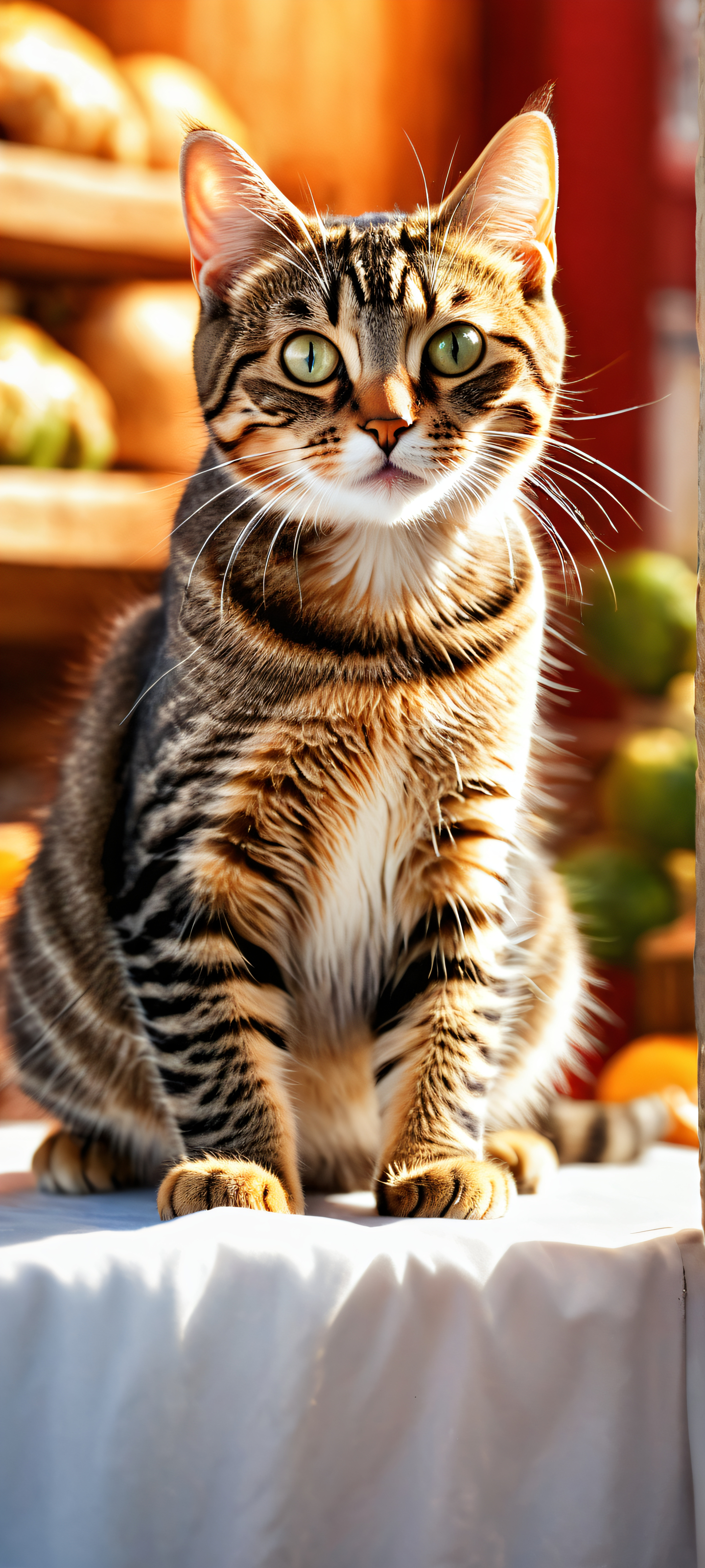 A breathtaking vertical portrait artwork of A small young tabby cat placed in the lower-middle, intricately hugging a large, shiny silver fish, with a determined facial expression and mid-shout. The surrounding environment is intentionally blurred to emphasize the subject’s micro-details., Perfectly clean and empty top half with vast pure void, allowing for seamless integration of UI widgets. Below, a bustling Dutch street market scene unfolds, featuring a market stall overflowing with fresh fishes to the right., Award-winning digital art, pristine clarity, and stunning visual impact, reminiscent of Apple UI design standards, Ethereal softbox lighting with subtle gradient effects, casting a warm glow on the subject’s fur and fish while highlighting the vibrant colors of the surrounding market scene, [‘Warm golden tones’, ‘Deep blues’, ‘Rich earthy reds’], ethereal lighting, radiant, brilliant colors, ray traced reflections, pristine clarity, portrait composition, centered subject in the lower middle, perfectly clean and smooth top half for UI, extreme depth of field blurred background, highly textured surfaces, intricate micro-details, physically based rendering, award-winning digital art, epic breathtaking scale, stunning visual impact, perfect composition, macOS wallpaper aesthetic, masterpiece, 2K QHD resolution, 9:20 aspect ratio.