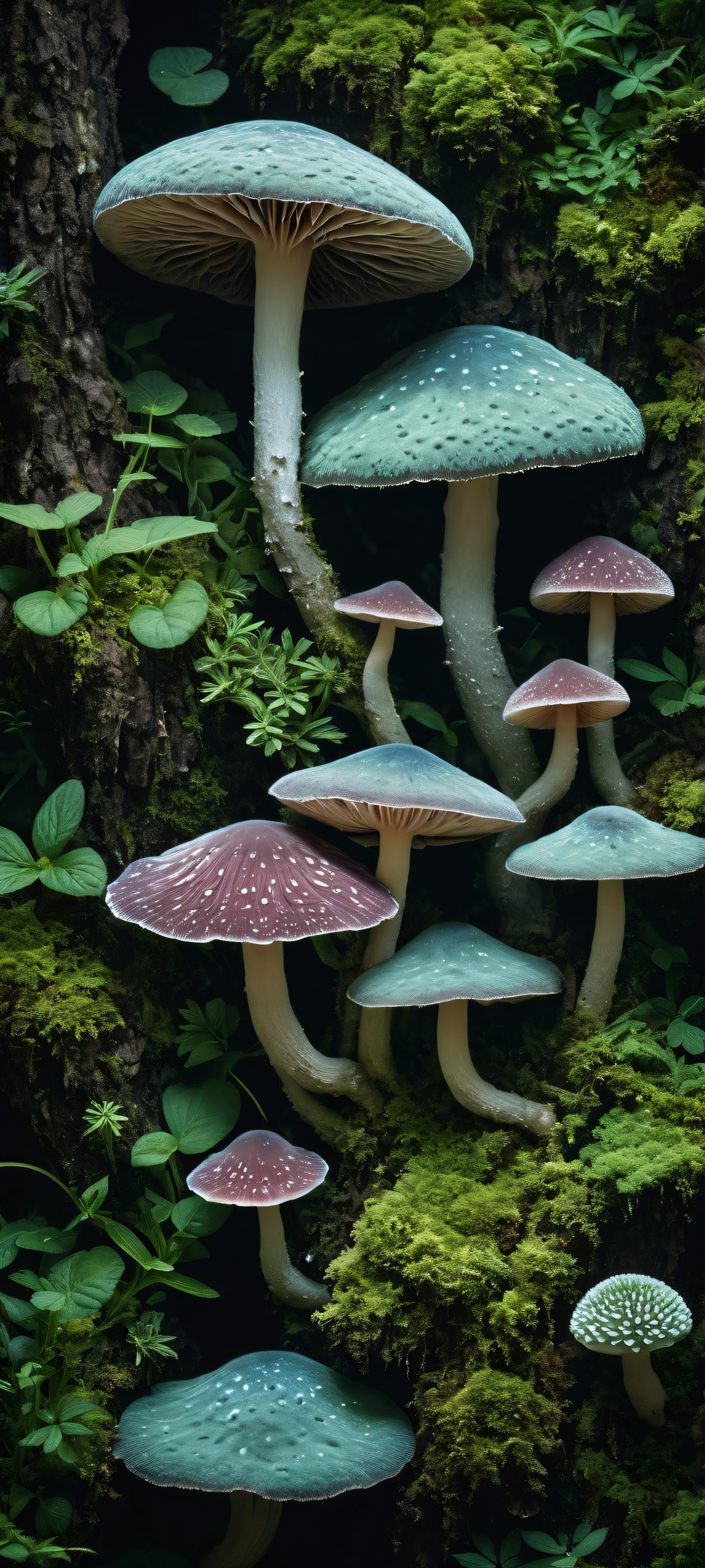 A breathtaking vertical portrait artwork of Fungal specimens placed in the lower-middle, intricate micro-details, Perfectly clean and empty top half with vast pure void, while lush greenery and fungal growths thrive below, Award-winning digital art, pristine clarity, Sleek dark mode aesthetic with deep perfect blacks and crisp contrast, illuminated by soft pastel glow, Soft pastel hues of pale blue, mauve, and mint, complemented by earthy tones of moss and fungi, elegant low-key lighting, deep perfect blacks, striking contrast, sleek dark mode aesthetic, luminescent accents, deep rich colors, portrait composition, centered subject in the lower middle, perfectly clean and smooth top half for UI, extreme depth of field blurred background, highly textured surfaces, intricate micro-details, physically based rendering, award-winning digital art, epic breathtaking scale, stunning visual impact, perfect composition, macOS wallpaper aesthetic, masterpiece, 2K QHD resolution, 9:20 aspect ratio.
