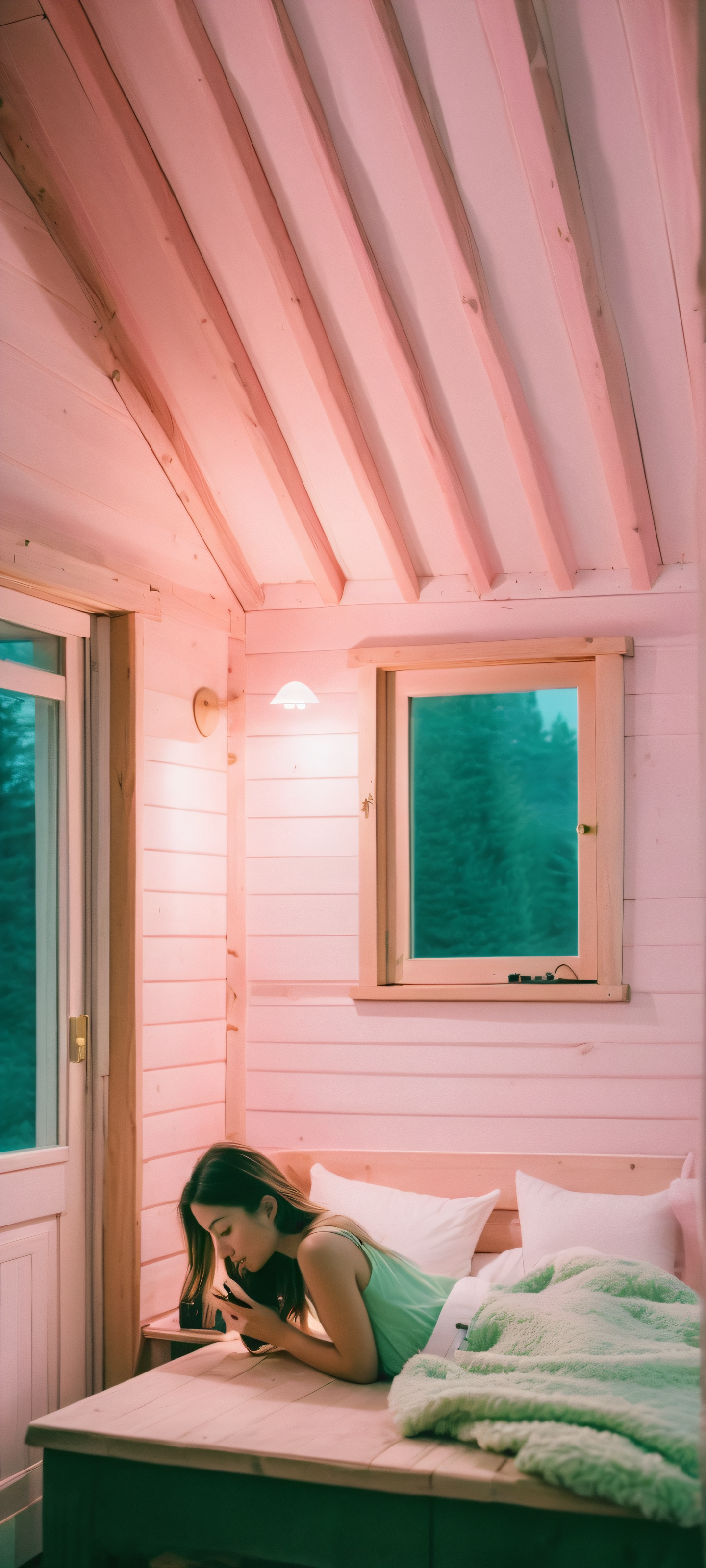 Girl sitting by a remote cabin at night with volumetric lighting. Perfect for iPhone/Android home screens.