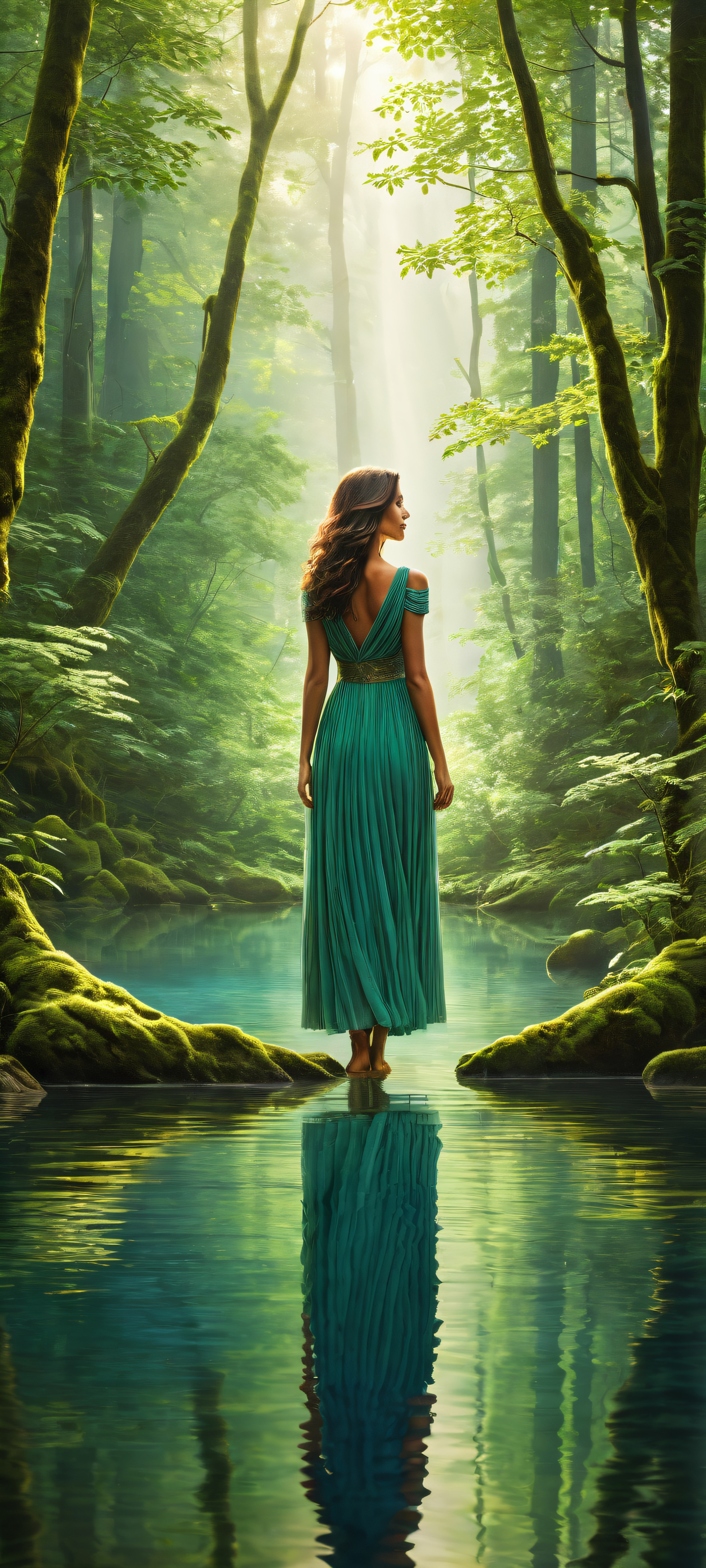 Perfectly optimized for your iPhone, Samsung Galaxy, or Android home screen, this breathtaking artwork features an ethereal portrait of a brunette standing amidst the tranquility of nature. The vast, pure void above her is mirrored by the serene lake surface below, reflecting the radiant colors and gentle wind rustling through tree leaves.