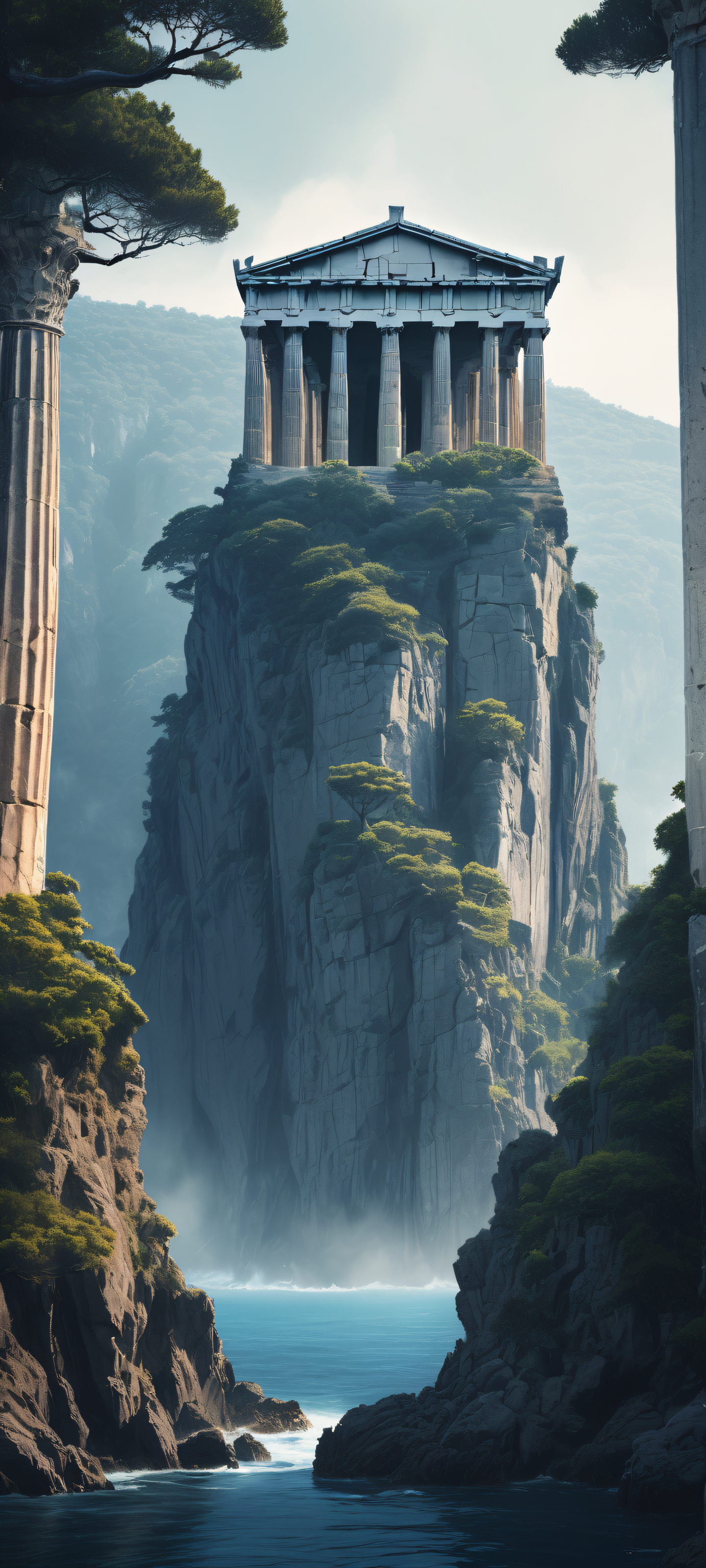 iPhone and Android users alike will be mesmerized by this stunning digital painting featuring a whimsical Greek temple standing tall against a haunting dark forest backdrop, perfectly optimized for home screens.