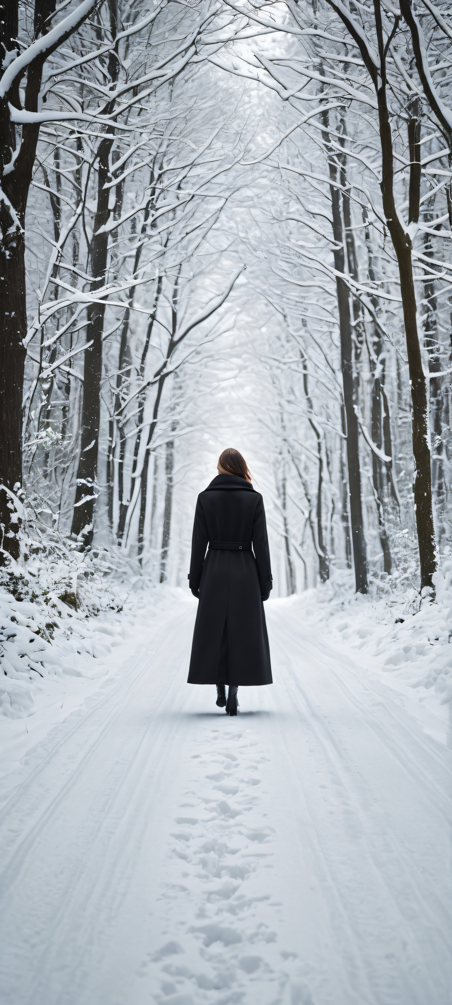 A breathtaking vertical portrait artwork of A solitary woman in a long black coat stands placed in the lower-middle with insane micro-details of snow-dusted road textures, winter forest foliage, and subtle film grain., Perfectly clean and empty top half with vast pure void above the woman, contrasting starkly with the desolate winter forest below., Award-winning digital art, pristine clarity, with a focus on dramatic storytelling and cinematic depth., Ethereal, soft, and radiant lighting with subtle ray-traced reflections on snow and leaves, creating an otherworldly atmosphere., Dominant palette: Deep blacks, rich grays, and snowy whites, with subtle hints of warmth from cinematic lighting, ethereal lighting, radiant, brilliant colors, ray traced reflections, pristine clarity, portrait composition, centered subject in the lower middle, perfectly clean and smooth top half for UI, extreme depth of field blurred background, highly textured surfaces, intricate micro-details, physically based rendering, award-winning digital art, epic breathtaking scale, stunning visual impact, perfect composition, macOS wallpaper aesthetic, masterpiece, 2K QHD resolution, 9:20 aspect ratio.