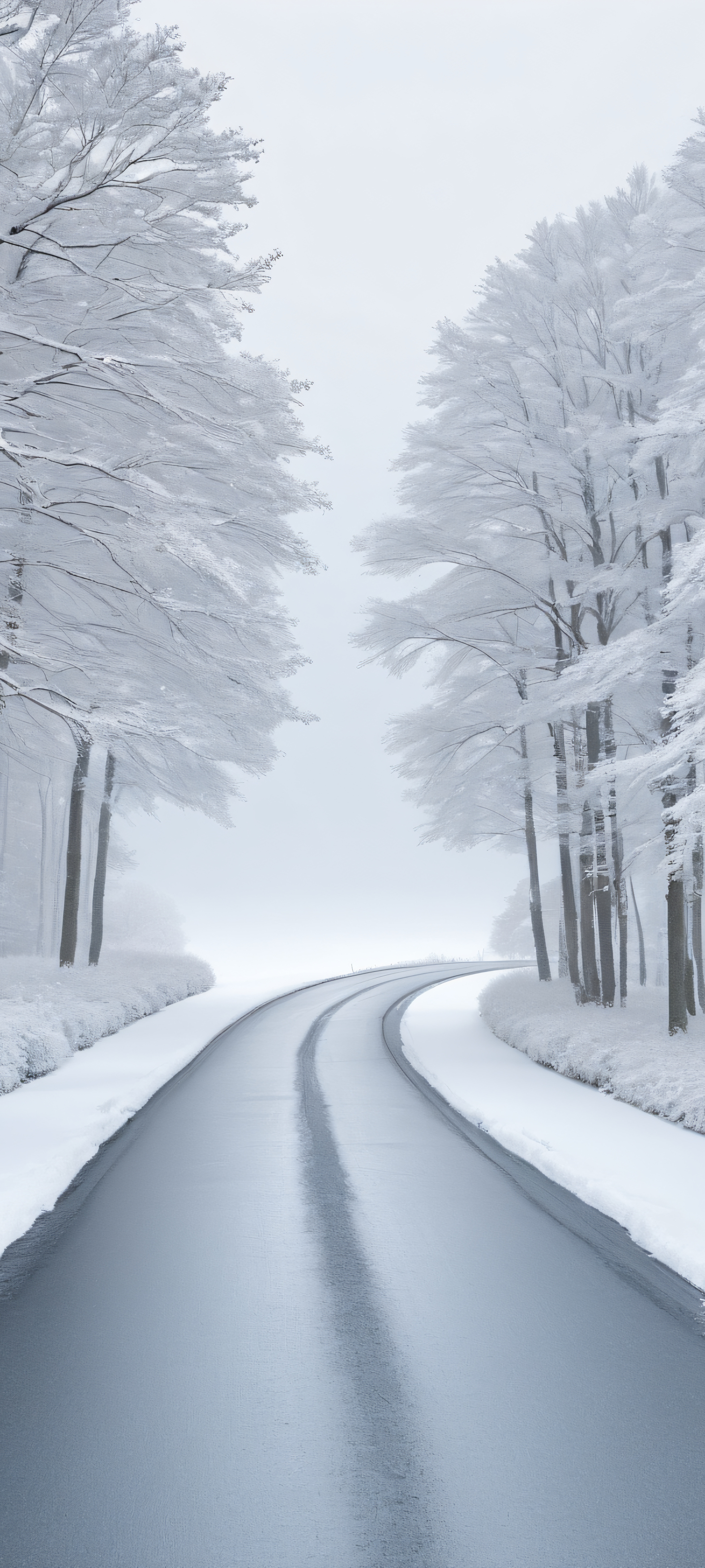 Step into a serene winter wonderland with this breathtaking 2K QHD masterpiece. The minimalist design features a snow-covered driveway leading to a tranquil lakefront, set against an overcast sky that echoes the bluish white hues of the snowy landscape. This stunning visual is specifically designed for optimal viewing on iPhone, Samsung Galaxy, and Android home screens.