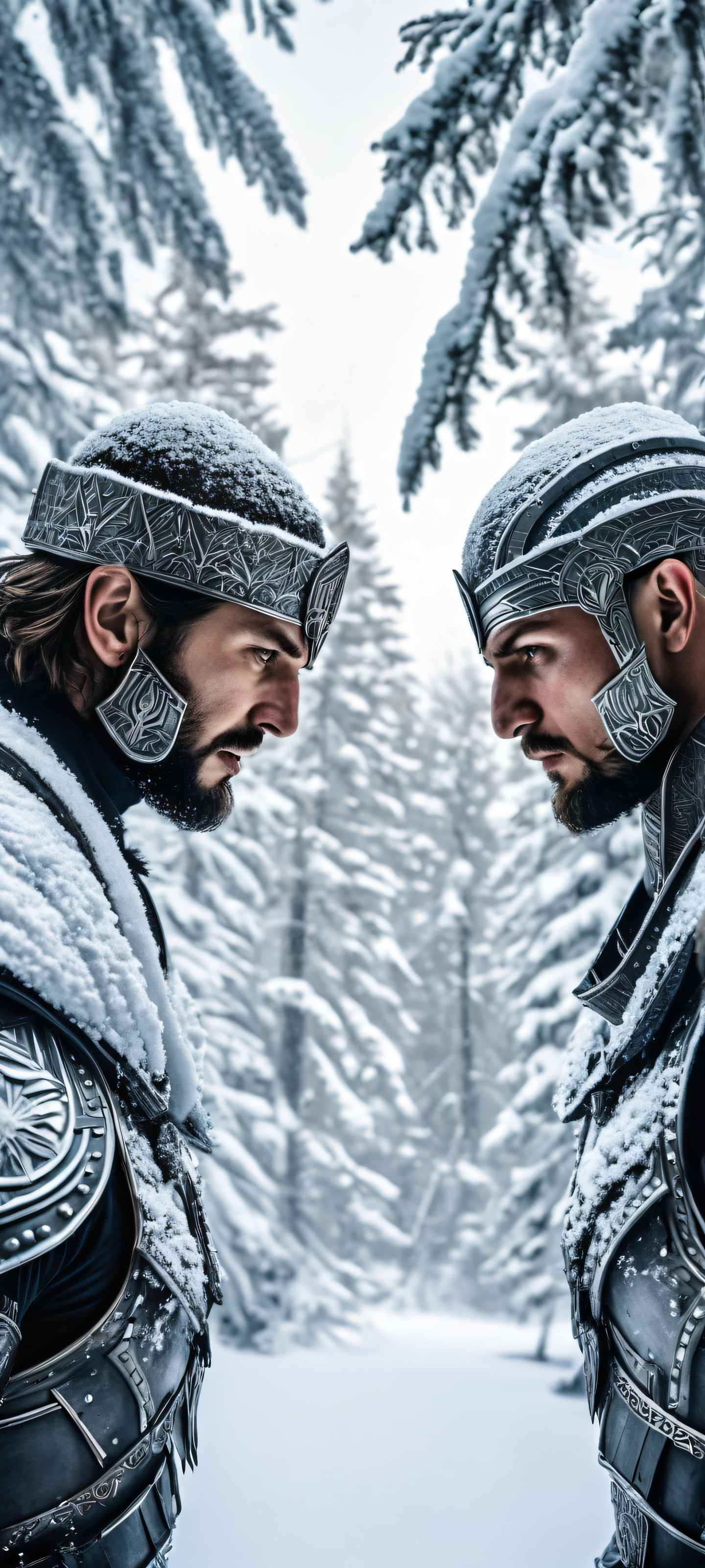 Step into the breathtaking world of ‘Winter’s Mystic Encounter’, where two imposing figures stand tall amidst the tranquility of a snow-covered winter wonderland. This stunning digital artwork is specifically designed to be perfectly optimized for your iPhone, Samsung Galaxy, and Android home screens, offering an immersive experience like no other.