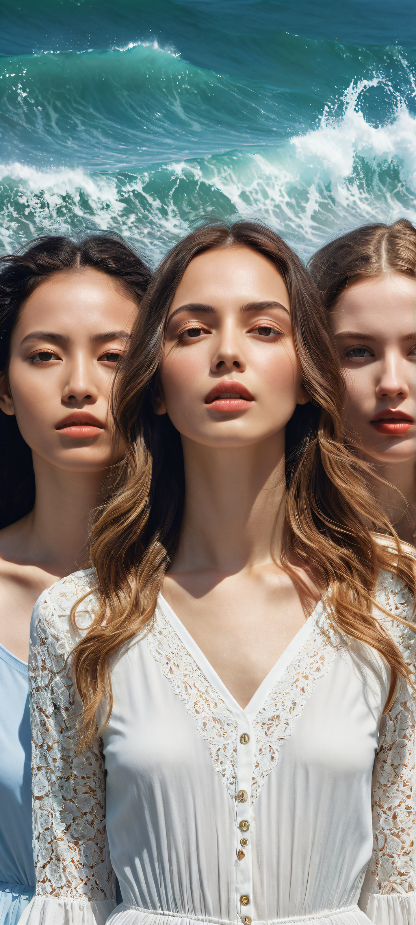 A breathtaking vertical portrait artwork of A trio of women, placed in the lower-middle with insane micro-details, standing with closed mouths and long hair, showcasing their unique two-tone hairstyles., The background features a perfectly clean and empty top half, with a vast pure void, creating a sense of UI breathing space for widgets. The bottom half is where the breathtaking Wuthering Waves unfold, showcasing the trio’s serene beauty., Award-winning digital art, stunning visual impact, and pristine clarity, reminiscent of a masterpiece that would trend on Wallhaven., Ethereal lighting illuminates the scene, with radiant, brilliant colors and ray-traced reflections that mimic the subtle play of light on rippling waves. The atmosphere is bright, airy, and full of promise., The dominant color palette consists of soft blues (#87CEEB) and whites (#FFFFFF), evoking a sense of calmness and serenity, as if the Wuthering Waves were gently lapping at the shore., ethereal lighting, radiant, brilliant colors, ray traced reflections, pristine clarity, portrait composition, centered subject in the lower middle, perfectly clean and smooth top half for UI, extreme depth of field blurred background, highly textured surfaces, intricate micro-details, physically based rendering, award-winning digital art, epic breathtaking scale, stunning visual impact, perfect composition, macOS wallpaper aesthetic, masterpiece, 2K QHD resolution, 9:20 aspect ratio.