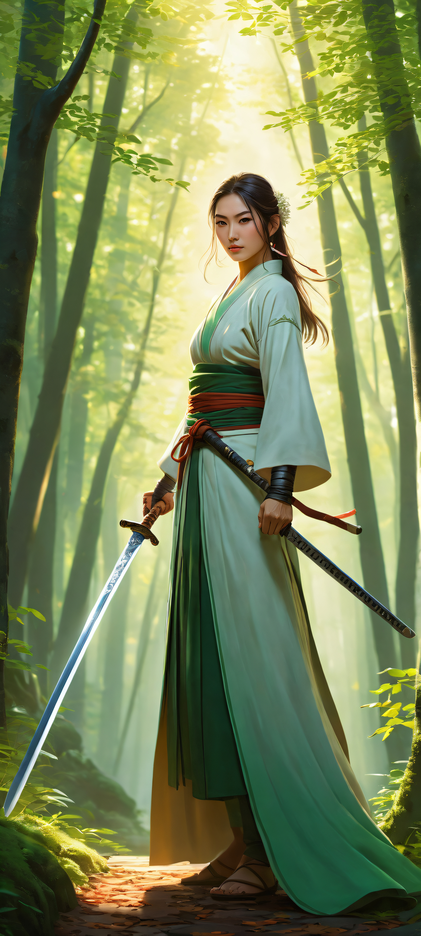 A breathtaking vertical portrait artwork of Zenin Maki placed in the lower-middle, intricate micro-details of her katana and surrounding foliage, Perfectly clean and empty top half with vast pure void, serene path winding through trees, leaves rustling gently in the breeze, Award-winning digital art, pristine clarity, stunning visual impact, Ethereal lighting, radiant and brilliant colors, ray-traced reflections casting a warm glow on Zenin Maki’s sword-wielding form, #FFC6B3, #8BC34A, #6495ED, with subtle gradients of green, echoing the calming atmosphere of a serene forest path at dawn, ethereal lighting, radiant, brilliant colors, ray traced reflections, pristine clarity, portrait composition, centered subject in the lower middle, perfectly clean and smooth top half for UI, extreme depth of field blurred background, highly textured surfaces, intricate micro-details, physically based rendering, award-winning digital art, epic breathtaking scale, stunning visual impact, perfect composition, macOS wallpaper aesthetic, masterpiece, 2K QHD resolution, 9:20 aspect ratio.